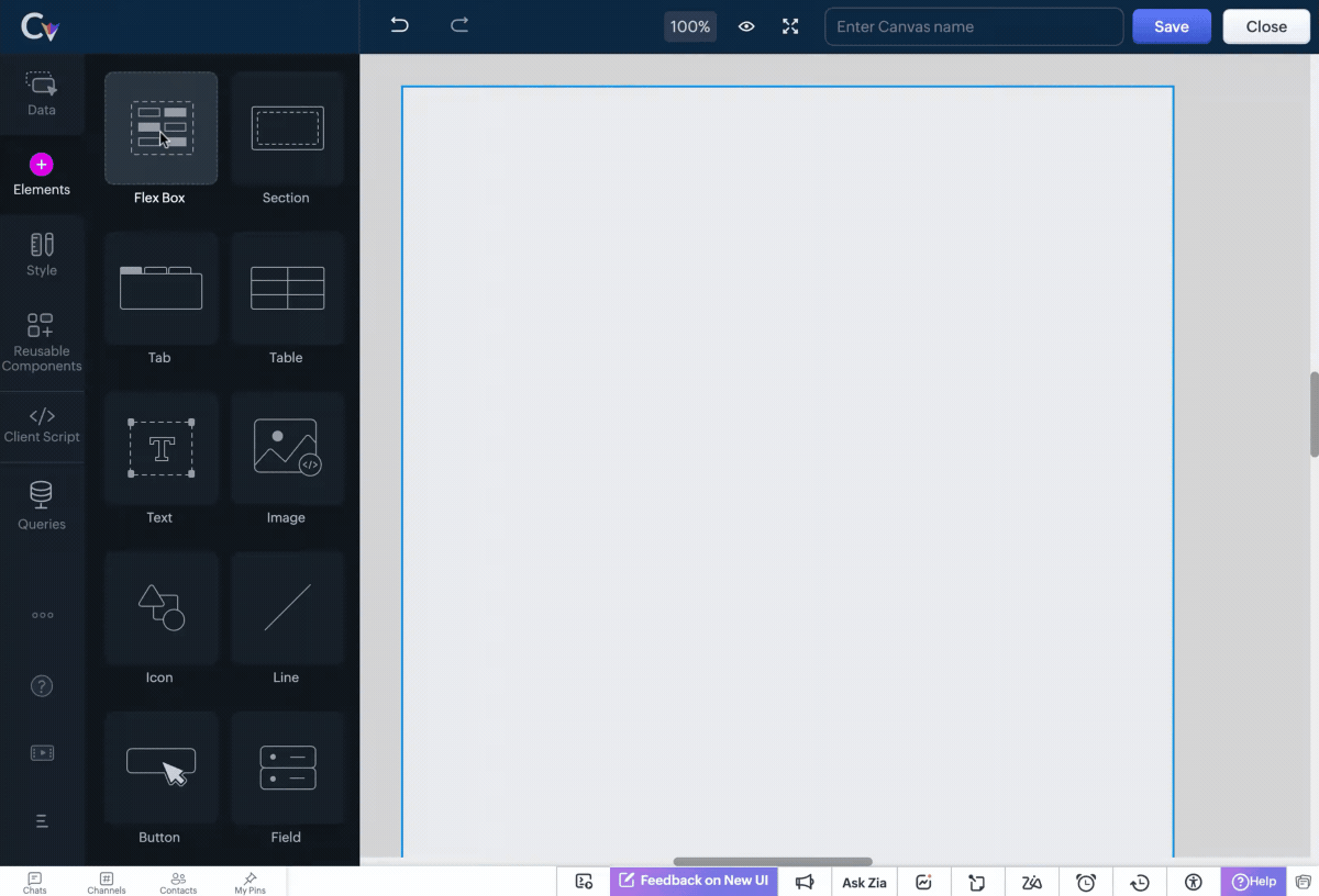 Canvas oferă o varietate de componente pe care le poți trage și plasa în layout-ul tău pentru a structura și stiliza paginile CRM după cum ai nevoie. Acestea includ: