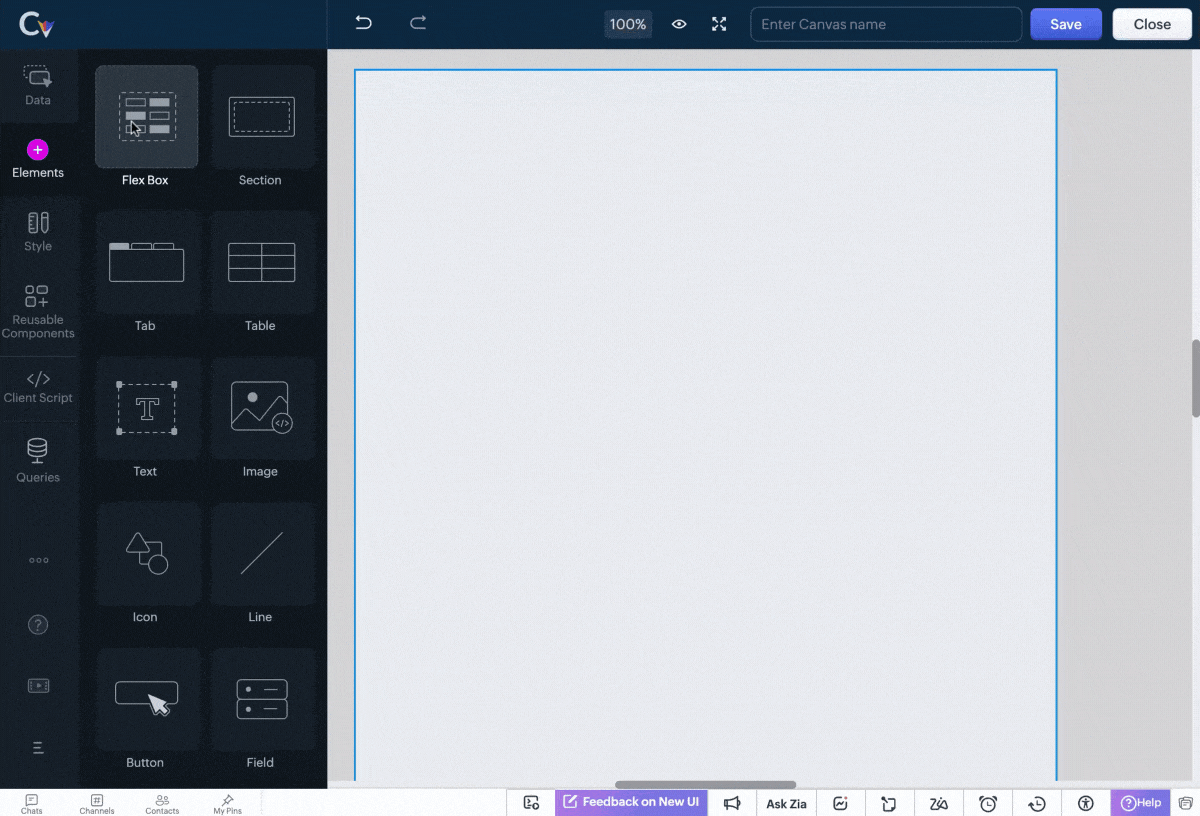 Componenta flex din Canvas te ajută să proiectezi layout-uri care se ajustează automat la diferite dimensiuni de ecran, îți permite să aranjezi elementele în rânduri sau coloane și asigură că layout-ul se adaptează fără probleme—toate acestea îmbunătățind experiența utilizatorului pe diferite dispozitive. Folosind componenta flex, layout-ul tău poate crește sau se poate micșora în funcție de dimensiunea ecranului, făcându-l responsive și atrăgător din punct de vedere vizual.