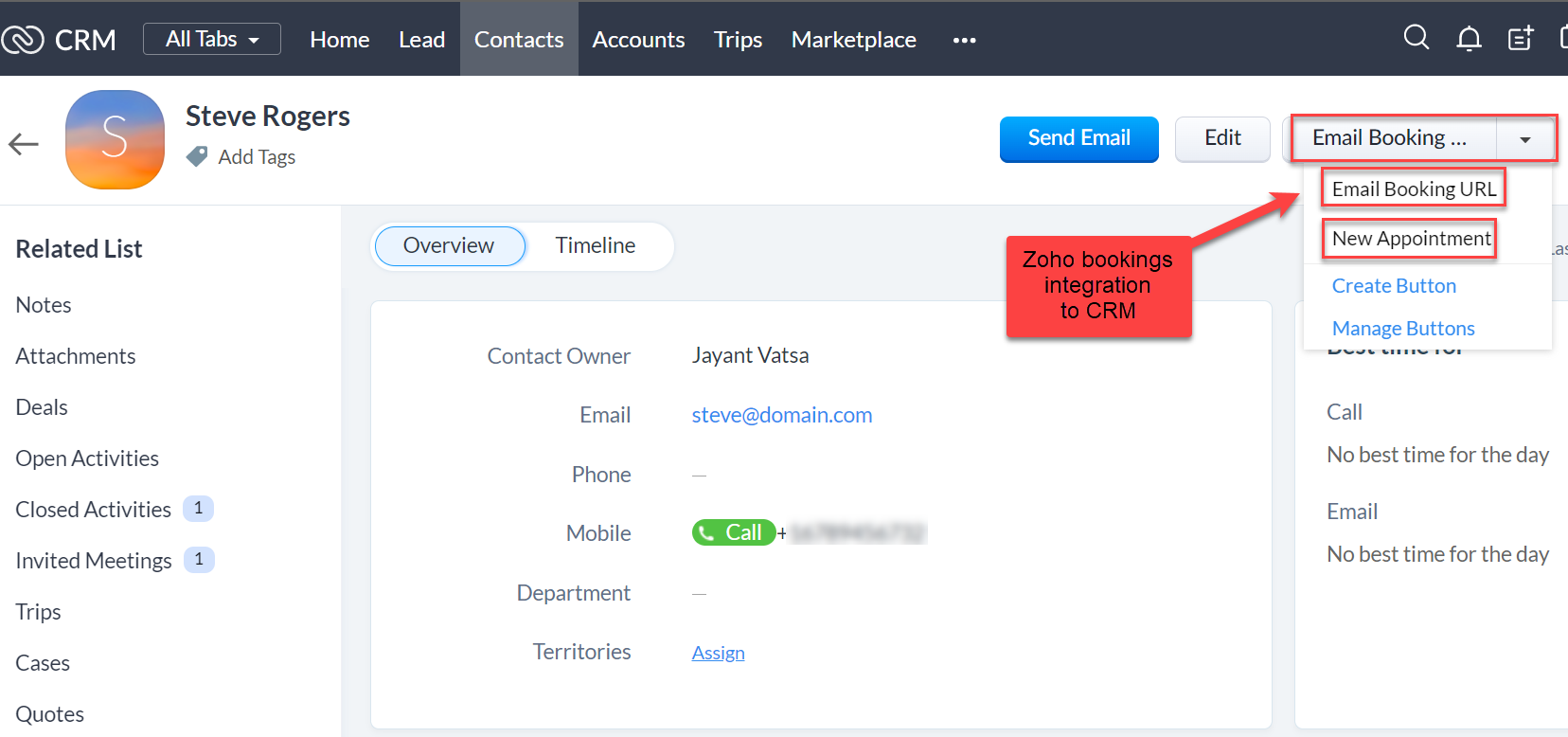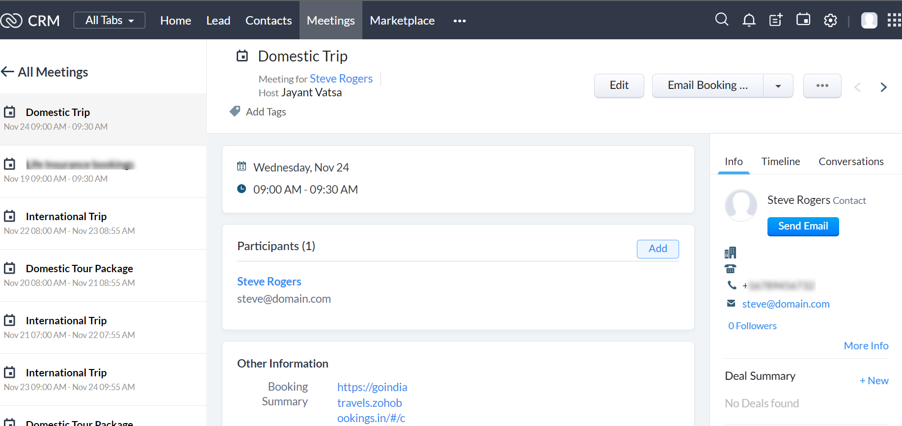 Poți programa cu ușurință o întâlnire direct din Zoho CRM. De exemplu, dacă un contact existent sună reprezentantul tău de vânzări pentru a programa o întâlnire și pentru a-i trimite detaliile rezervării pe email, poți facilita acest lucru cu ușurință prin CRM.