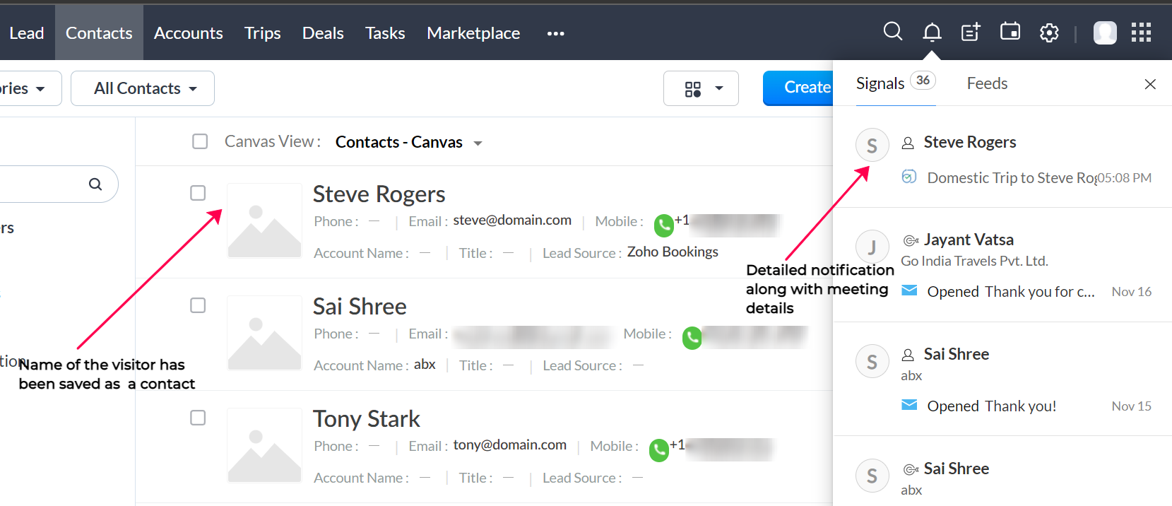 Odată ce Zoho Bookings este instalat în Zoho CRM, trebuie să-l configurezi pentru a-l putea folosi. Trebuie să alegi un modul în care să adaugi noii clienți Zoho Bookings. În captura de ecran de mai sus, o companie de turism numită Go India Travels folosește Zoho Bookings pentru a adăuga automat contactele în Zoho CRM.