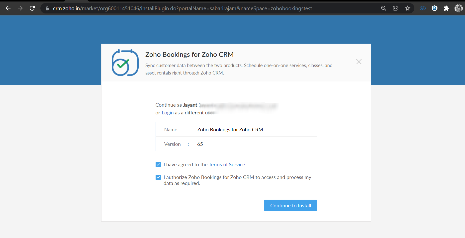 - Autorizează Zoho CRM să se conecteze cu contul tău Zoho Bookings pentru a sincroniza datele. Dacă nu ai un cont Zoho Bookings, poți crea unul făcând clic pe Înregistrare. Odată ce autorizezi conectarea datelor, Zoho Bookings va fi conectat la Zoho CRM.