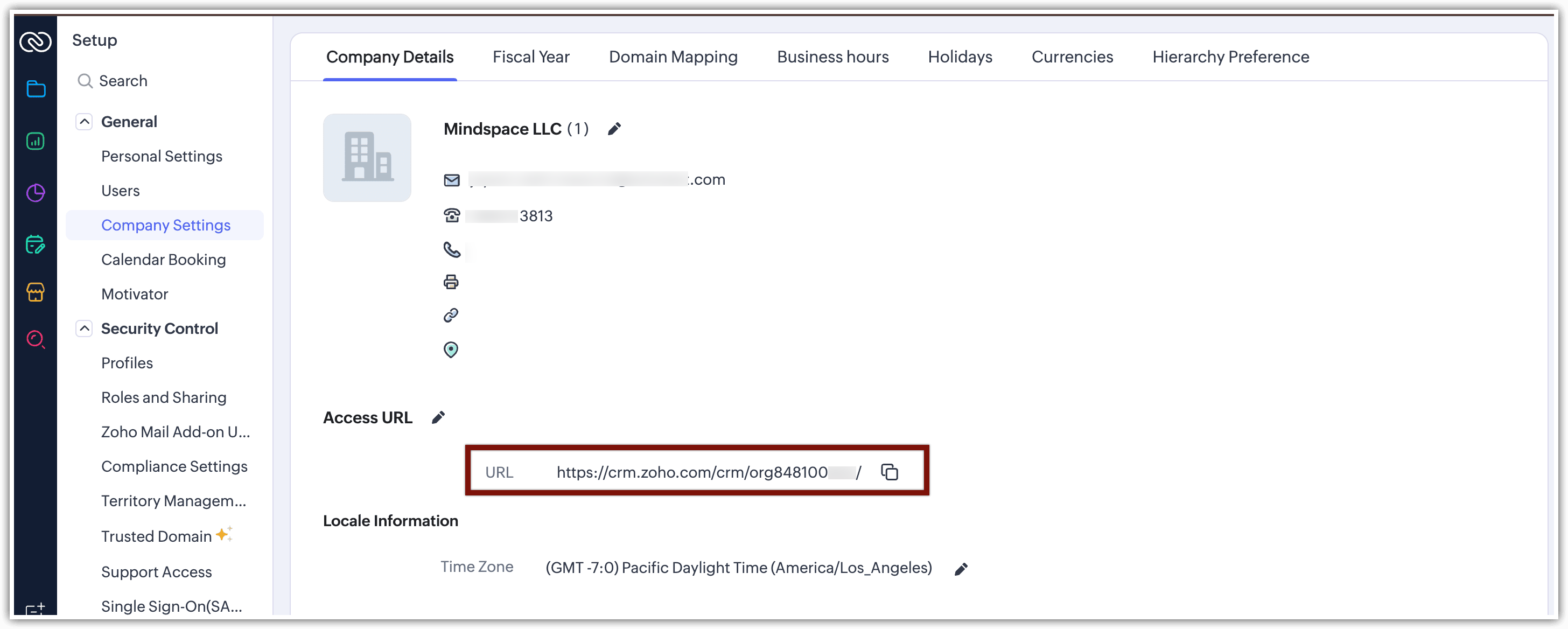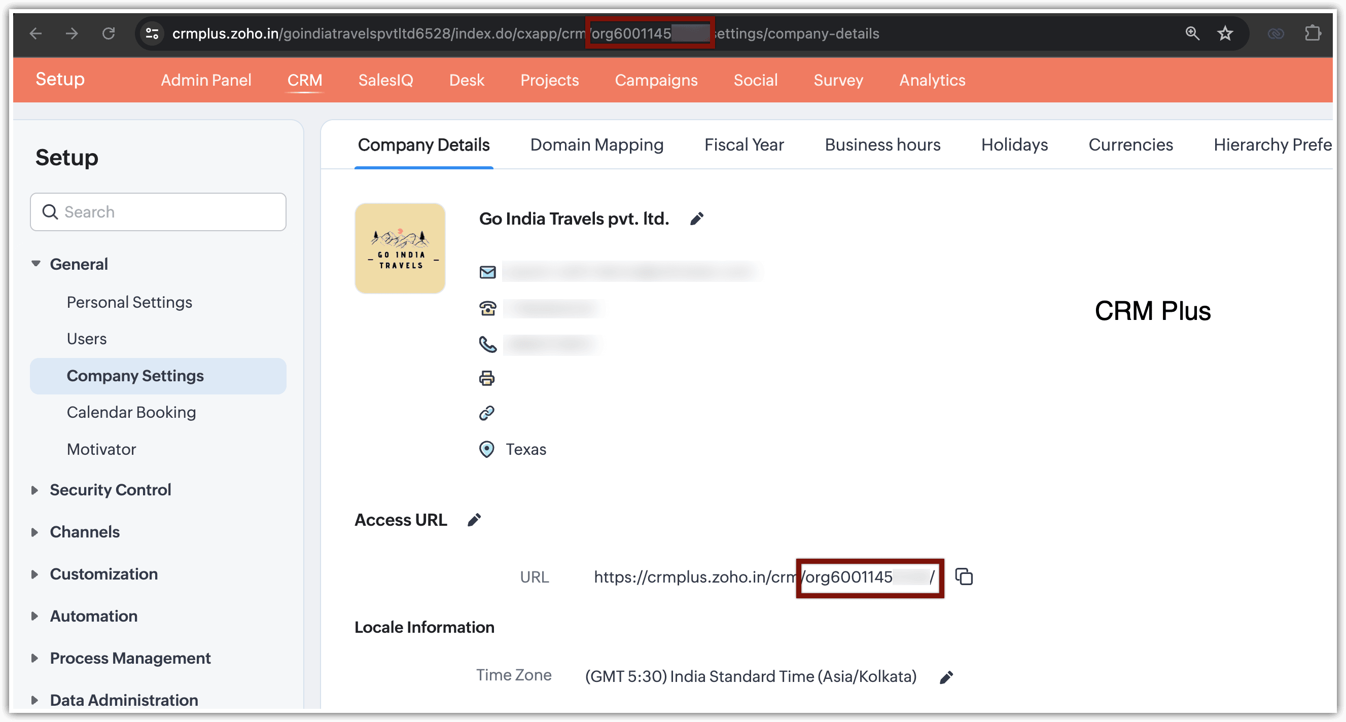 Pentru a obține Org ID-ul contului tău CRM în Zoho One sau CRM Plus, navighează la Setup > General > Company Setting > Company Details > URL > Org(numeric).