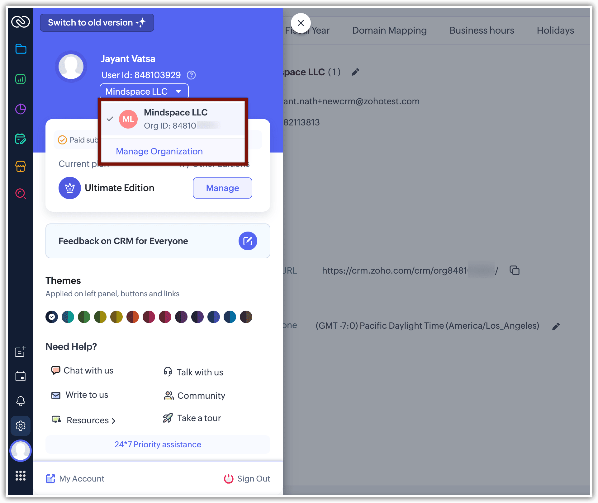 Poți găsi cu ușurință ID-ul organizației tale făcând clic pe imaginea de profil din colțul din stânga-jos al contului tău CRM. Acolo vei vedea numele organizației tale. Fă clic pe meniul derulant pentru a vizualiza numele organizației și Org ID-ul.