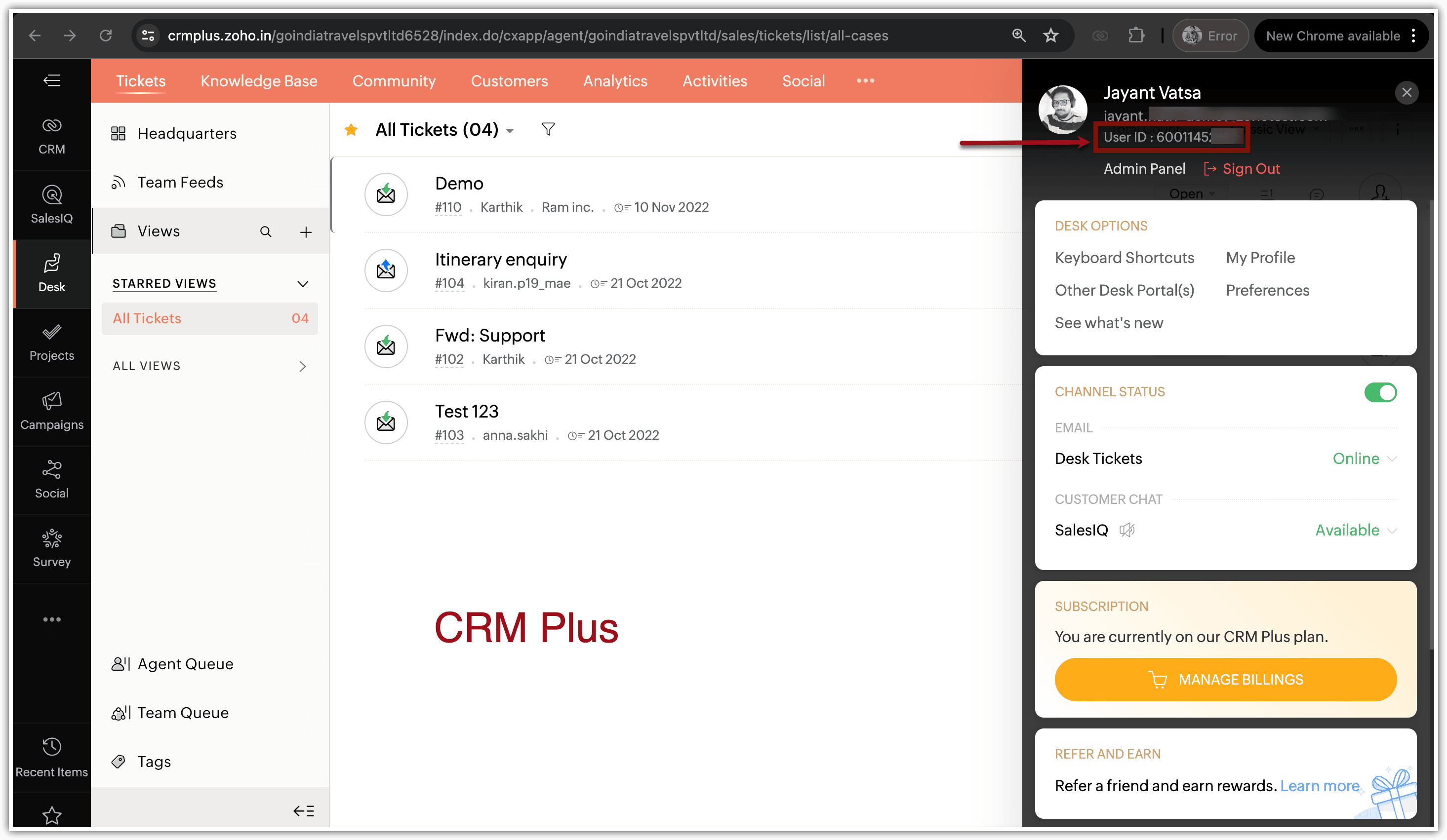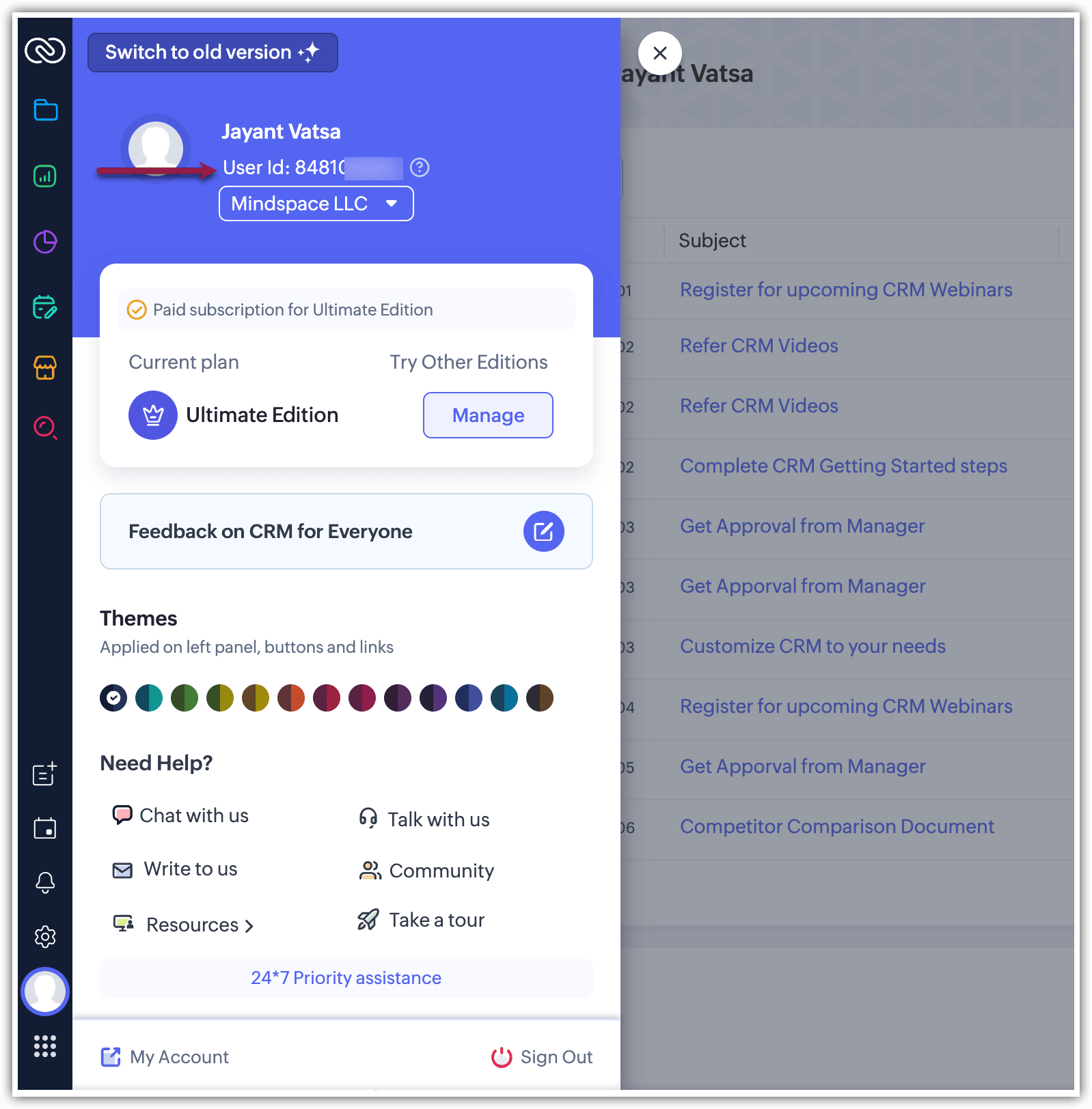 Pentru a-ți găsi Zoho User ID-ul, fă clic pe imaginea de profil situată în colțul din stânga-jos al contului tău CRM. Zoho User ID-ul tău va fi afișat acolo.