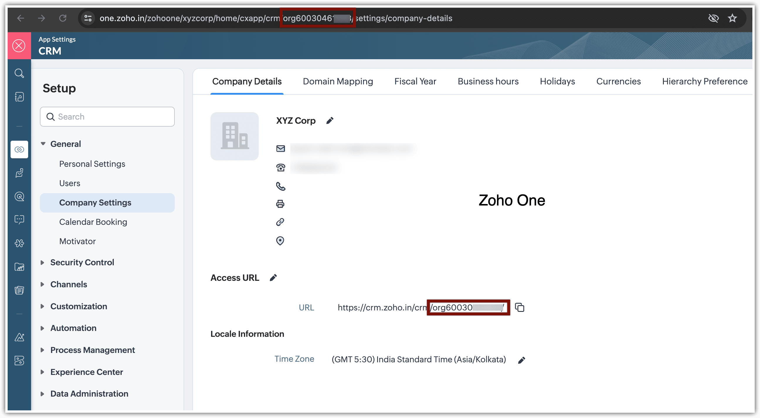 ID-ul organizației este un identificator numeric unic atribuit automat fiecărei organizații din Zoho CRM. ID-ul unic poate fi găsit în Setup > General > Company Setting > Company Details > URL > org(numeric). Acest ID face compania ușor de recunoscut de către sistem și o reprezintă în mod unic pe serverele Zoho.