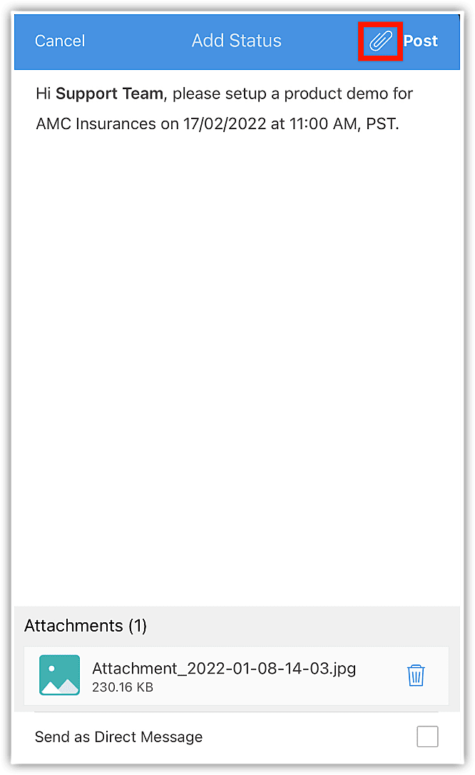 - Apasă pictograma de atașament din colțul din dreapta sus pentru a încărca fișiere.