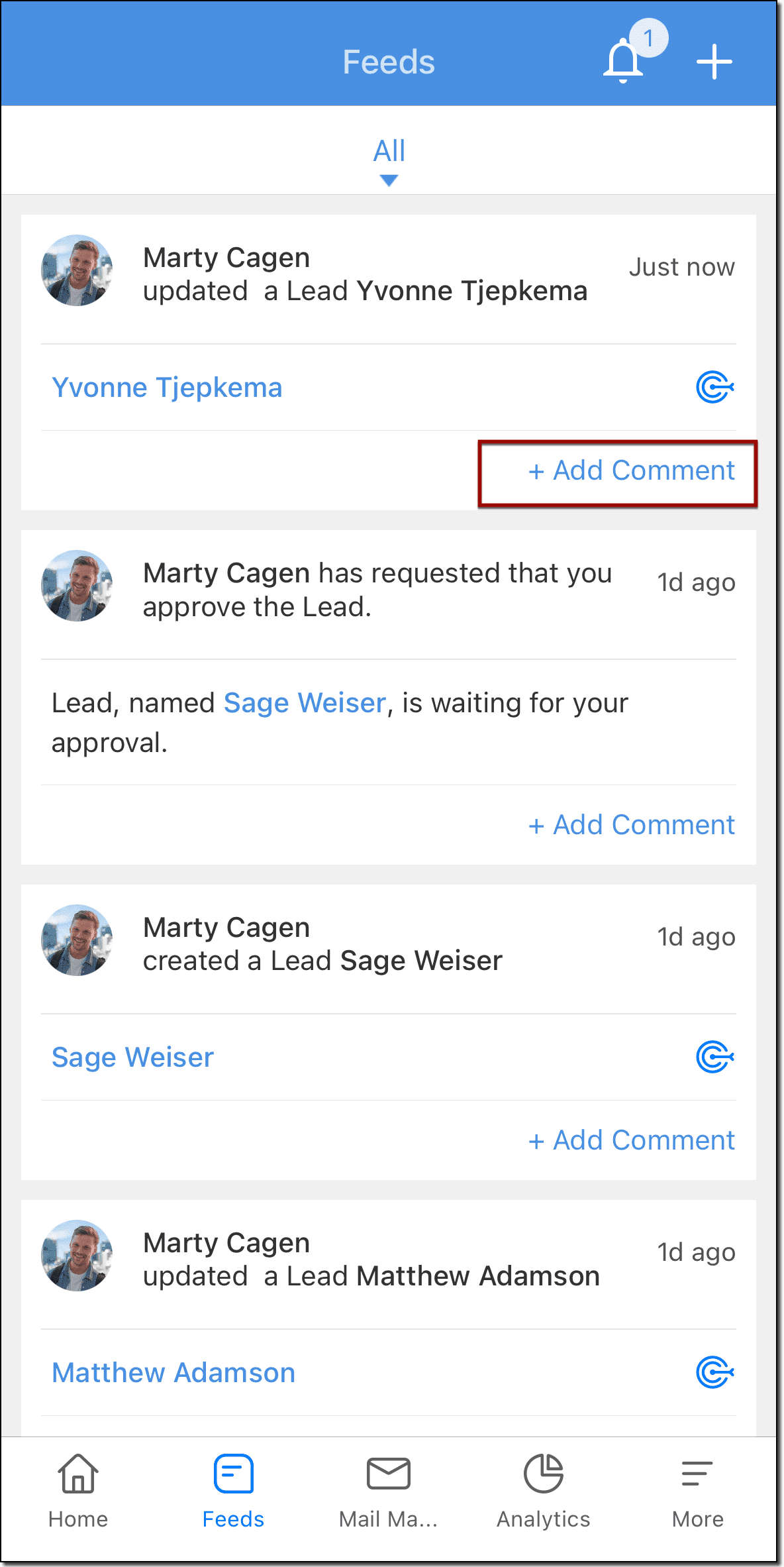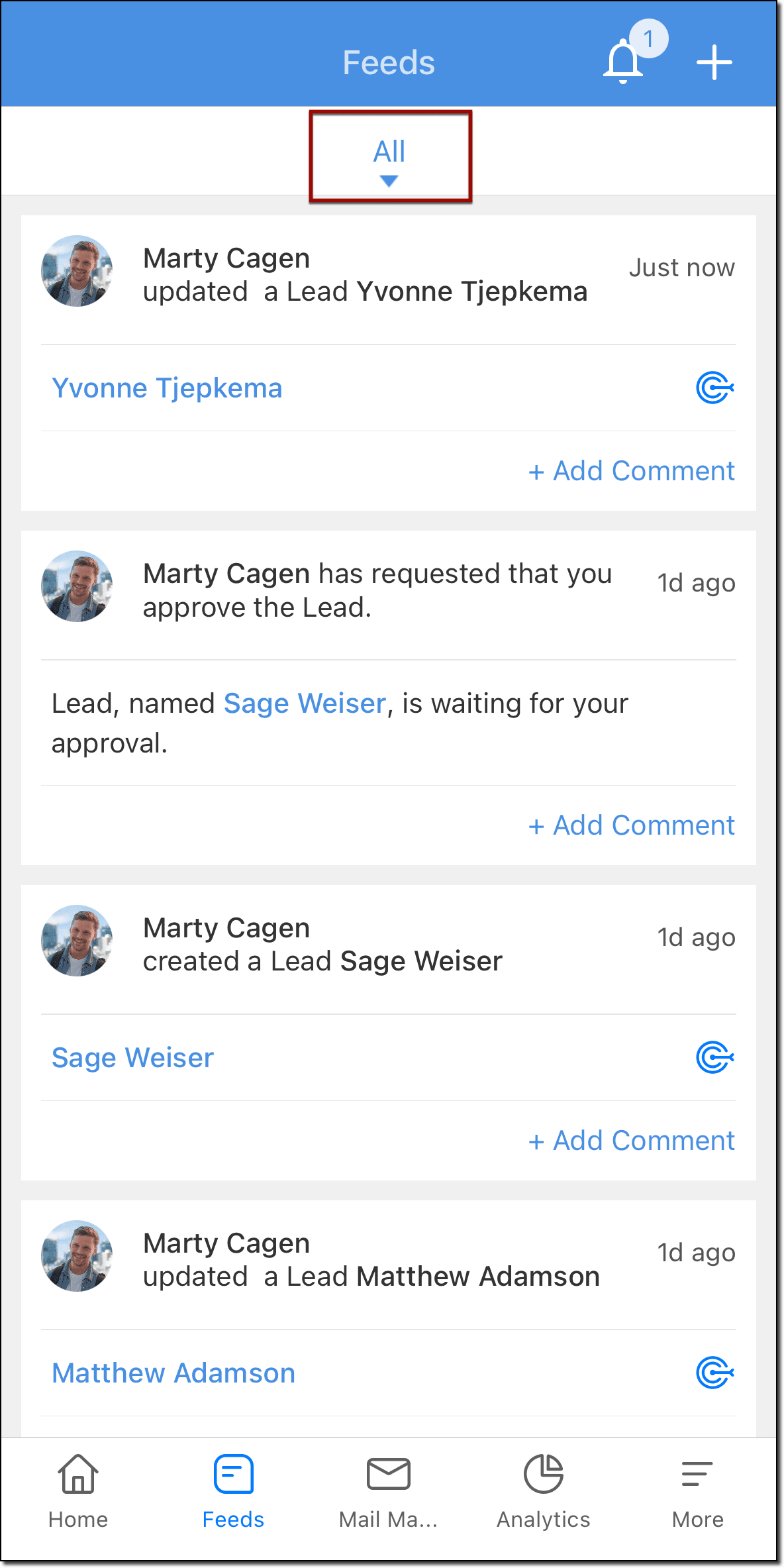Folosind Feeds în Zoho CRM, poți comunica clar cu echipa ta și poți împărtăși idei despre aspecte importante ale afacerii. Feeds îți oferă, de asemenea, actualizări despre înregistrările importante pe care le urmărești, cum ar fi cine a actualizat o înregistrare și ce modificări au fost făcute. În cadrul fluxurilor de știri, vor fi listate toate mesajele de stare, mențiunile, comentariile, mesajele directe, modificările aduse înregistrărilor pe care le deții, notele adăugate la înregistrări, înregistrările șterse și multe altele.