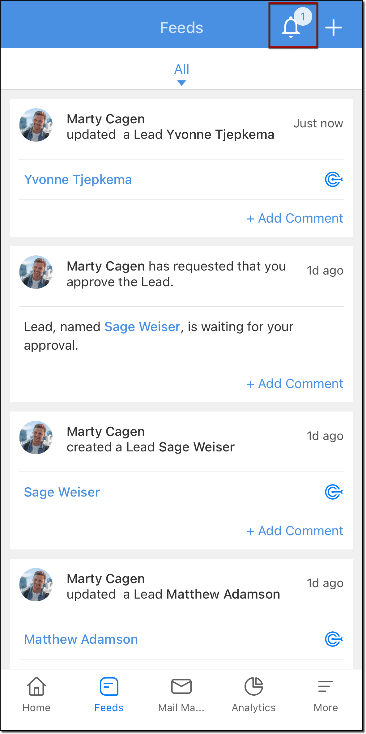 - Accesează Feeds în aplicația ta Zoho CRM.