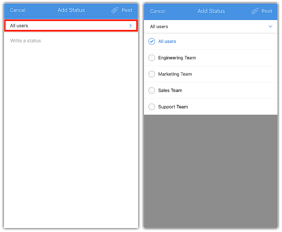 Poți, de asemenea, posta actualizări de stare specifice unui grup făcând clic pe vizualizarea All Users și selectând grupul preferat.