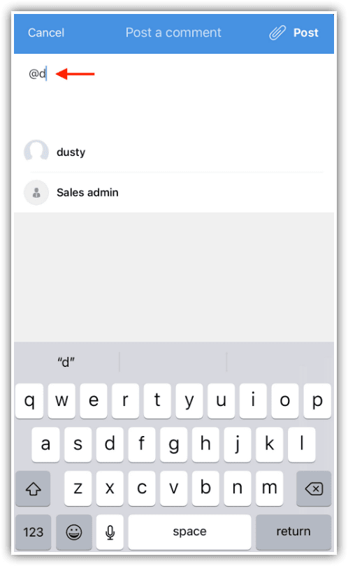 - Pentru a menționa un utilizator, introdu @ și tastează numele de utilizator. Alege utilizatorul dorit din lista de nume.