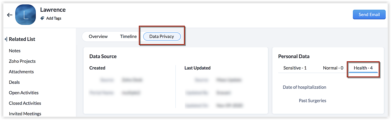 Toate câmpurile marcate ca și conținând date de sănătate personale vor fi listate în pagina de detalii a înregistrării. Sub Data Privacy, în secțiunea Personal Data, poți apăsa pe tab-ul Health pentru a vizualiza câmpurile care au date de sănătate personale.