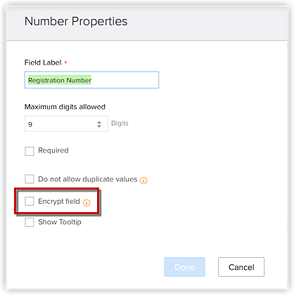Câmpurile criptate primesc atributul Encryption at Rest (EAR). Citește mai multe despre criptare în Documentul Zoho privind Criptarea.