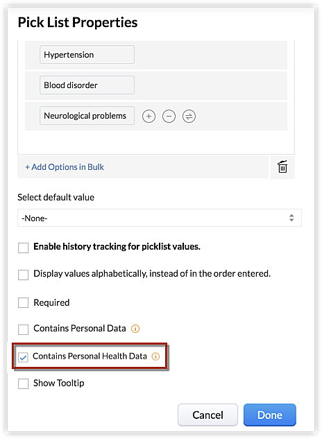 - Marchează câmpurile ca și conținând informații de sănătate personale: Într-un modul, pot exista doar câteva câmpuri care conțin detalii de sănătate personale ale unui client. De exemplu, istoricul chirurgical, simptome, detalii despre medicație etc. Marcarea acestor câmpuri ca date de sănătate personale va ajuta sistemul să identifice și să restricționeze accesul la aceste câmpuri prin API și să prevină exportul valorilor din aceste câmpuri. Un total de 25 de câmpuri din fiecare modul pot fi marcate ca și câmpuri care conțin date de sănătate personale.