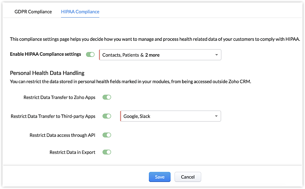 Odată cu numărul tot mai mare de organizații din domeniul sănătății care folosesc CRM pentru a-și gestiona activitatea și a stoca informațiile clienților într-o bază de date partajată, este esențial ca acestea să poată asigura confidențialitatea informațiilor de sănătate ale persoanelor. În Zoho CRM, oferim modalități pentru ca organizațiile din domeniul sănătății să securizeze și să restricționeze exportul informațiilor de sănătate ale persoanelor și să rămână conforme cu ghidurile HIPAA.