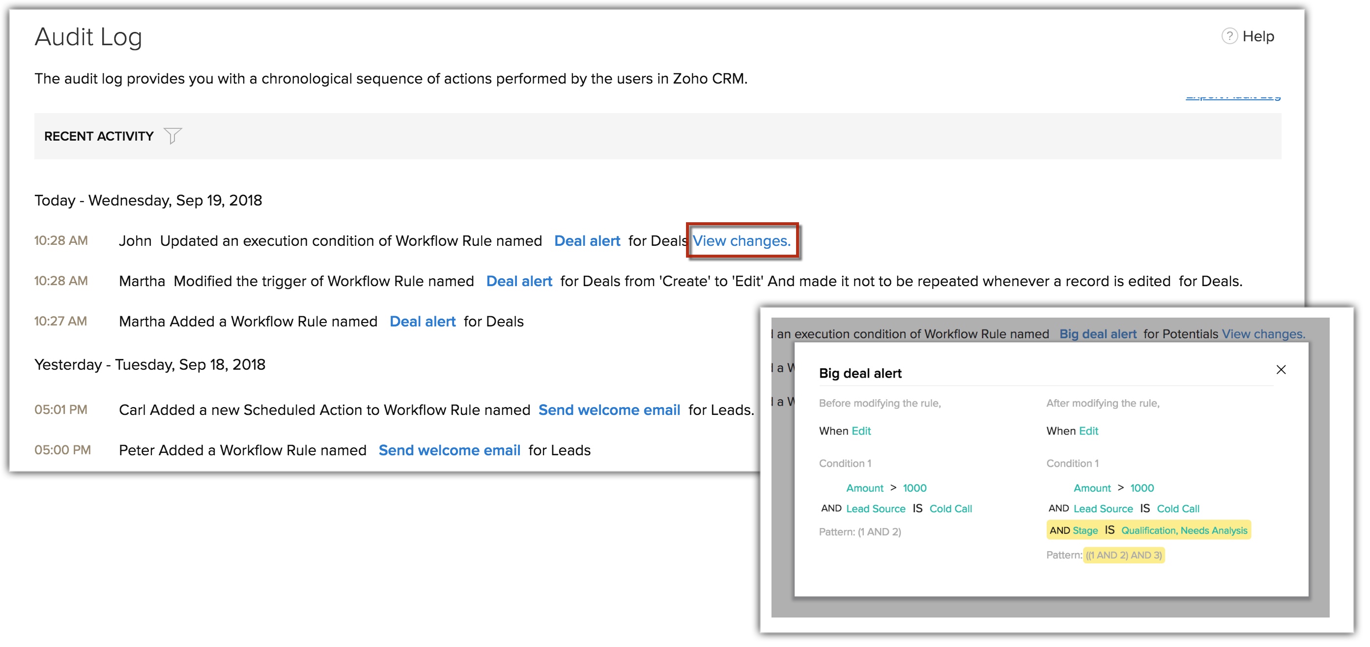 Poți vizualiza detaliile fiecărei actualizări efectuate asupra regulilor de workflow în jurnalul de audit. Fiecare acțiune efectuată într-un workflow, cum ar fi creare, editare, actualizare, ștergere, modificare, blocarea unei reguli sau adăugarea unei acțiuni etc., va fi afișată împreună cu detaliile actualizării. De asemenea, poți vizualiza modificările aduse condițiilor de execuție făcând clic pe View Changes.