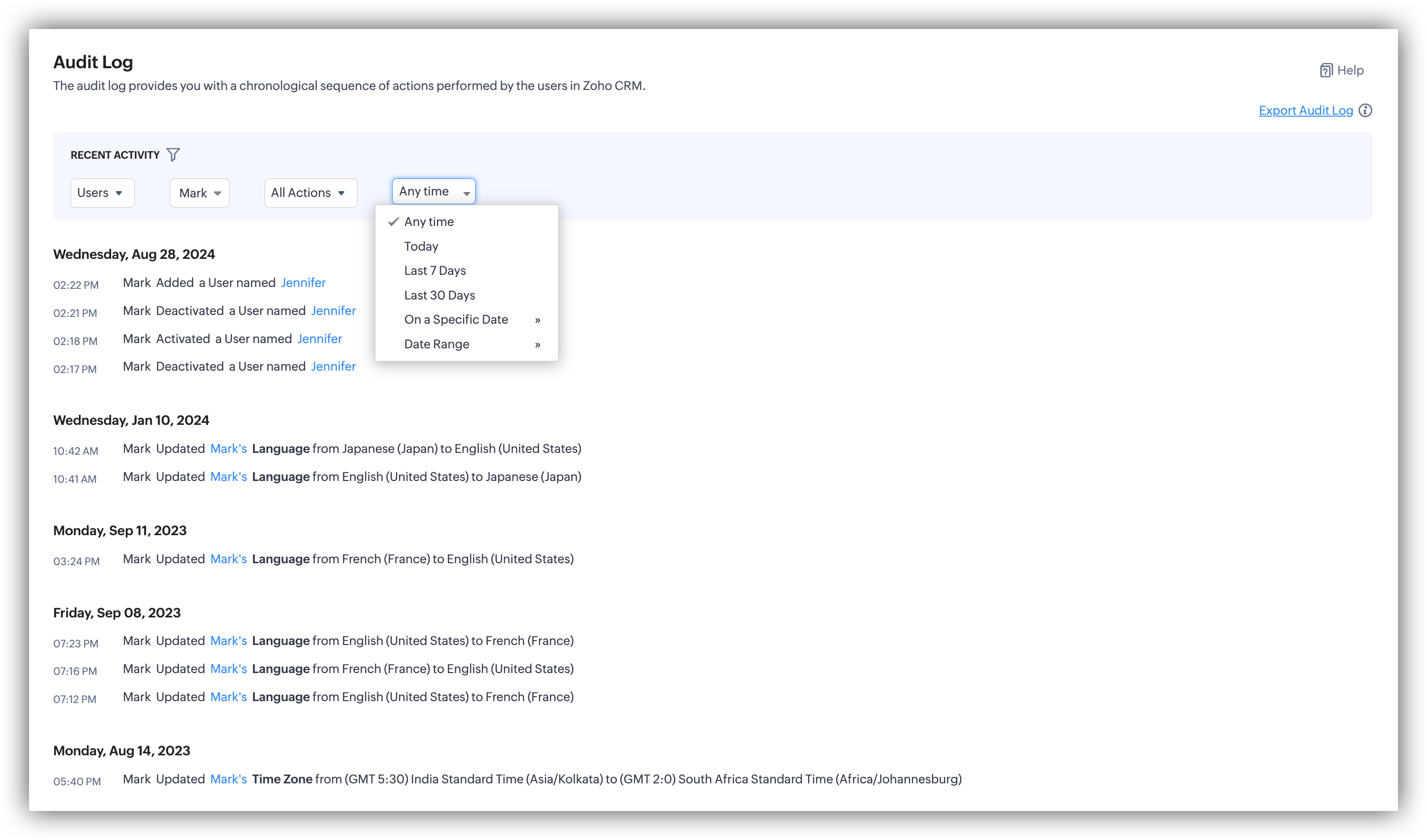 Jurnalul de audit afișează activitățile efectuate de utilizatori în organizația ta în contul CRM. Utilizatorii cu Profil de Administrator sau Rol de CEO pot accesa jurnalele de audit. Cu toate acestea, ceilalți utilizatori pot vizualiza doar propriile jurnale de audit și pe cele ale subordonaților lor.