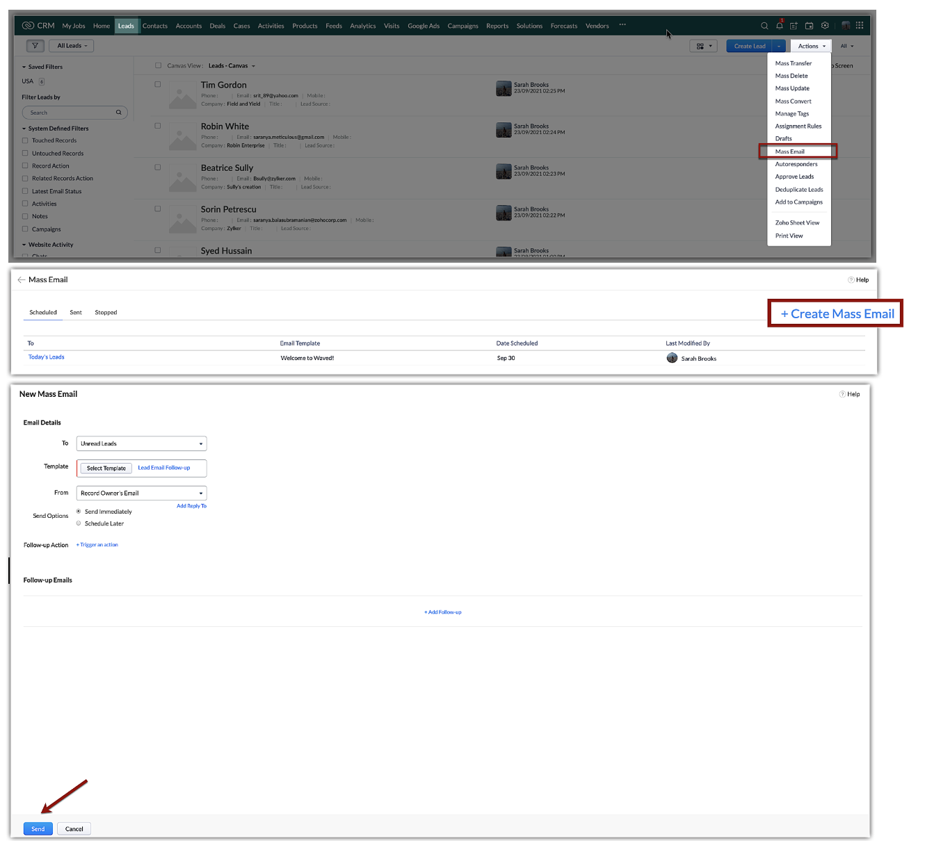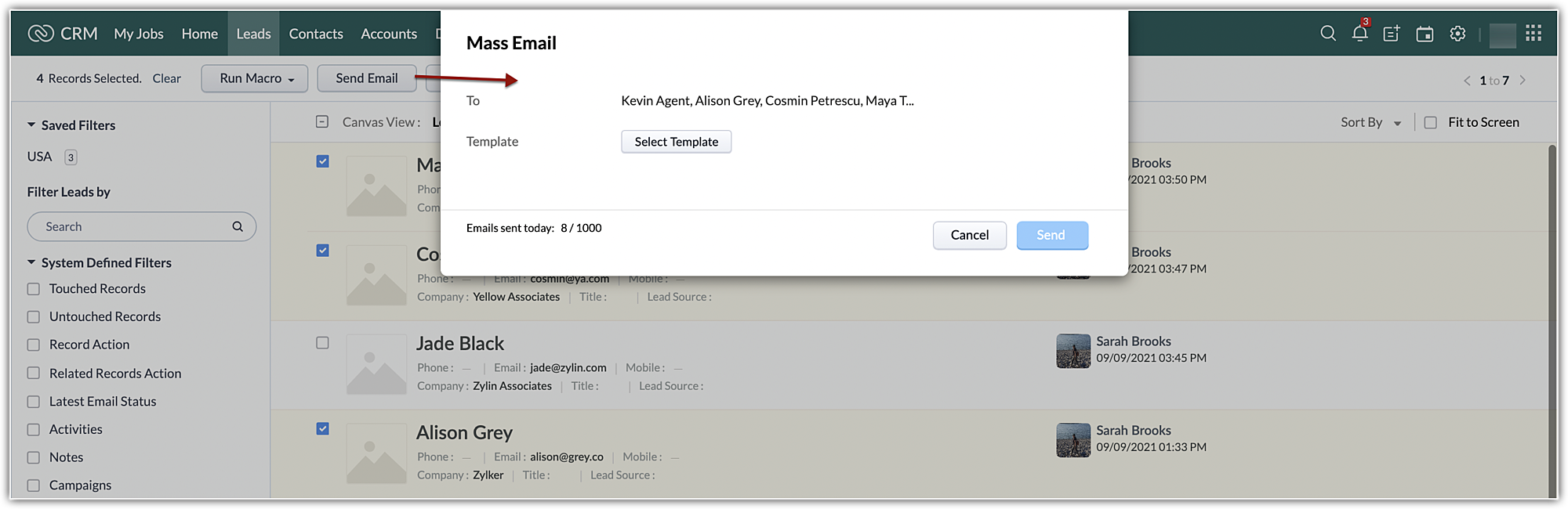 Mail Sent Status is Not Sent - Trimite emailuri în masă - Selectează lead-urile/contactele din vizualizarea de listă pe care ai creat-o și trimite emailuri în masă.