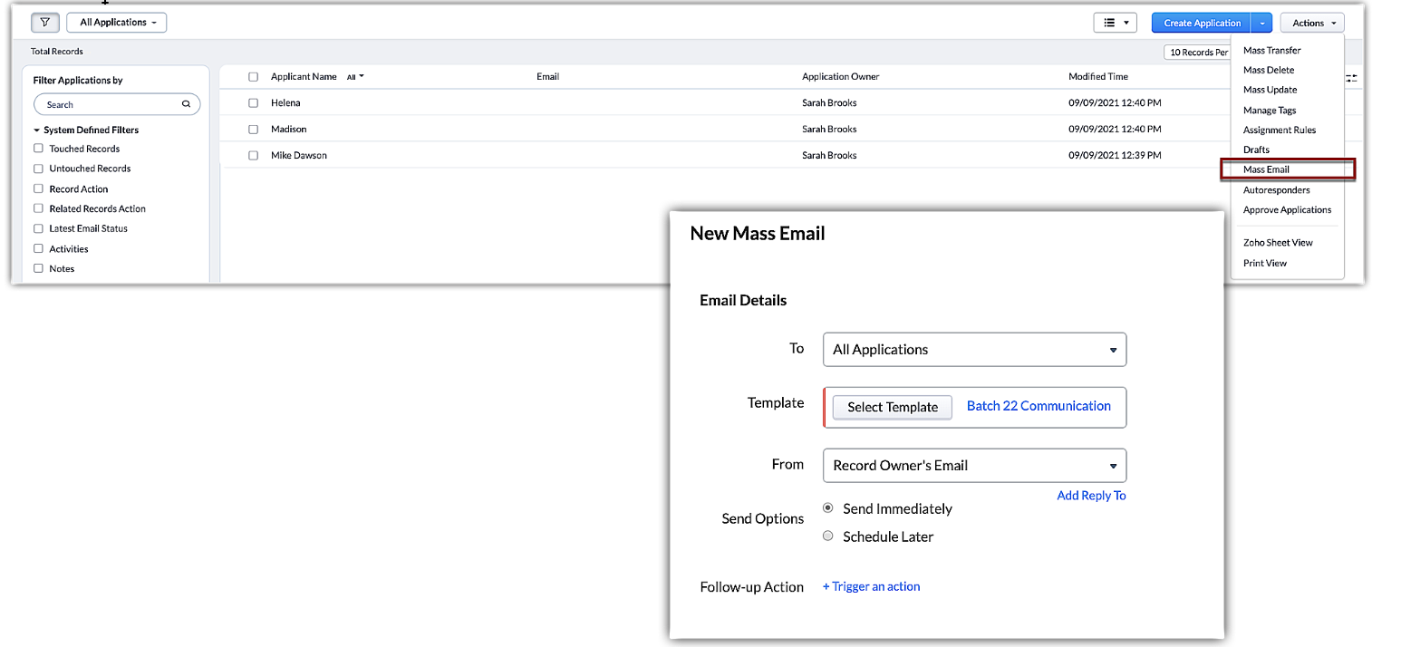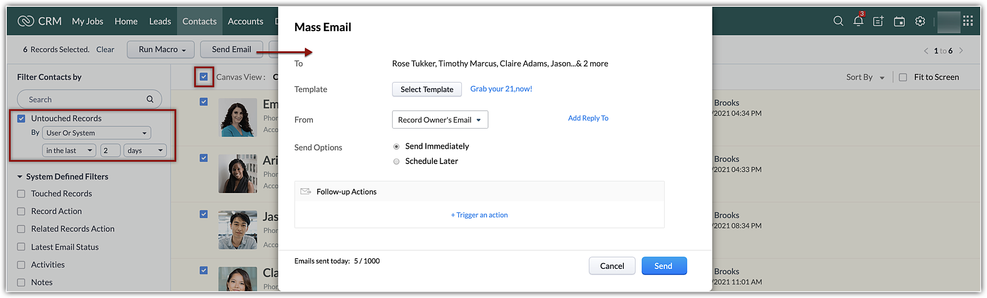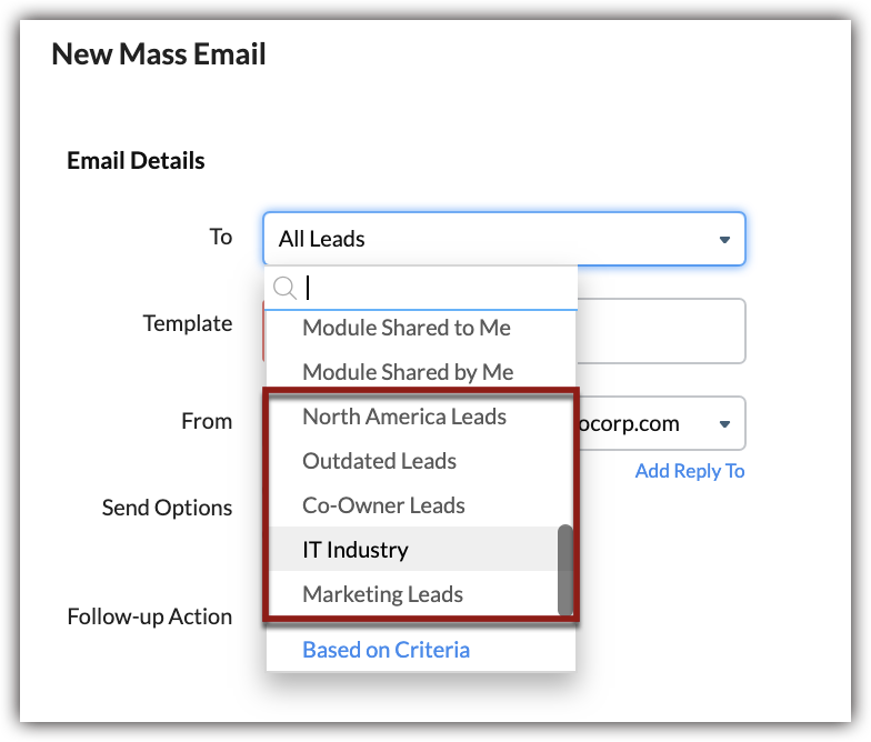 Selecție manuală: Selectează înregistrările manual din lista de înregistrări dintr-un modul și apoi selectează opțiunea Send Email. Aceasta este o acțiune în masă care îți permite să trimiți un email către mai mulți destinatari.
