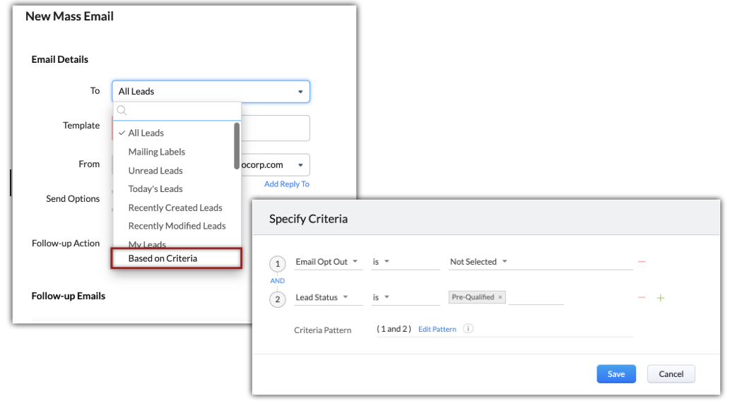 Criterii pe pagina Mass Email: Selectează destinatarii pe pagina Mass Email pe baza unor criterii specifice, cum ar fi lead-uri precalificate sau oferte aflate în analiză, și trimite-le emailuri în masă.