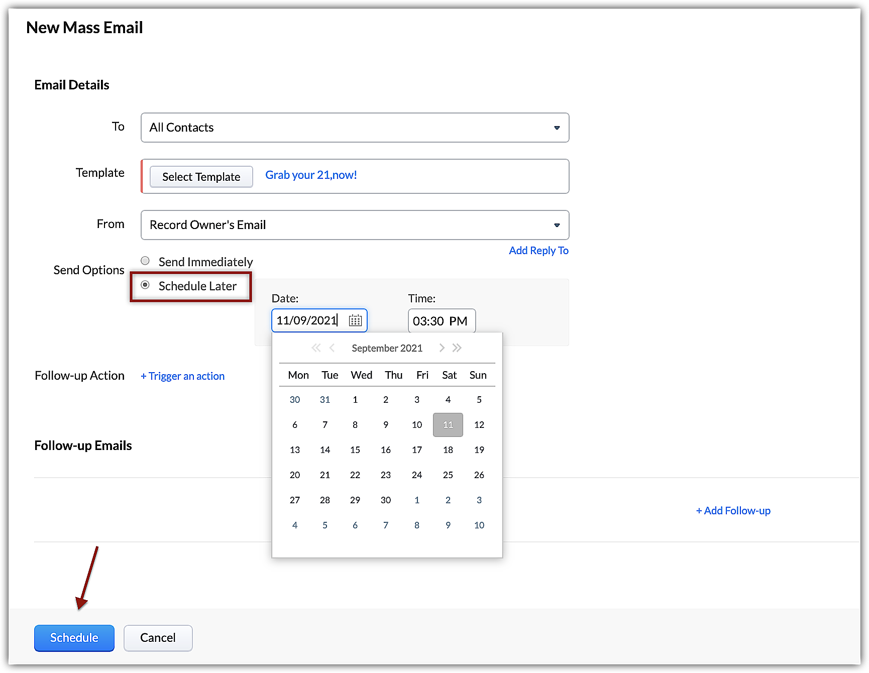 13. Cum se programează emailurile în masă în Zoho CRM?