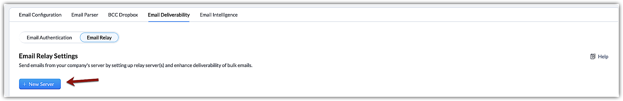 - Fă clic pe + New Server pe pagina Email Relay Settings.