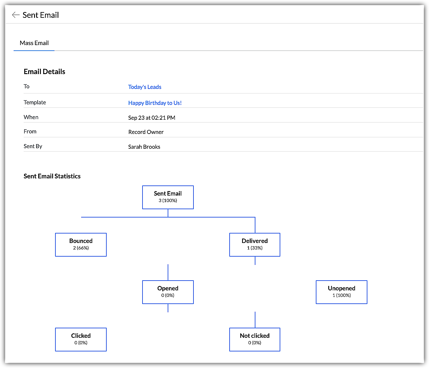 - Selectează emailul pentru care vrei să verifici statisticile din lista emailurilor în masă trimise.Pagina Sent Email va afișa atât detaliile emailului, cât și statisticile. Statistici precum Sent Email, Delivered, Opened, Clicked, Bounced, Unopened, și Not Clicked sunt afișate ca o diagramă flux.