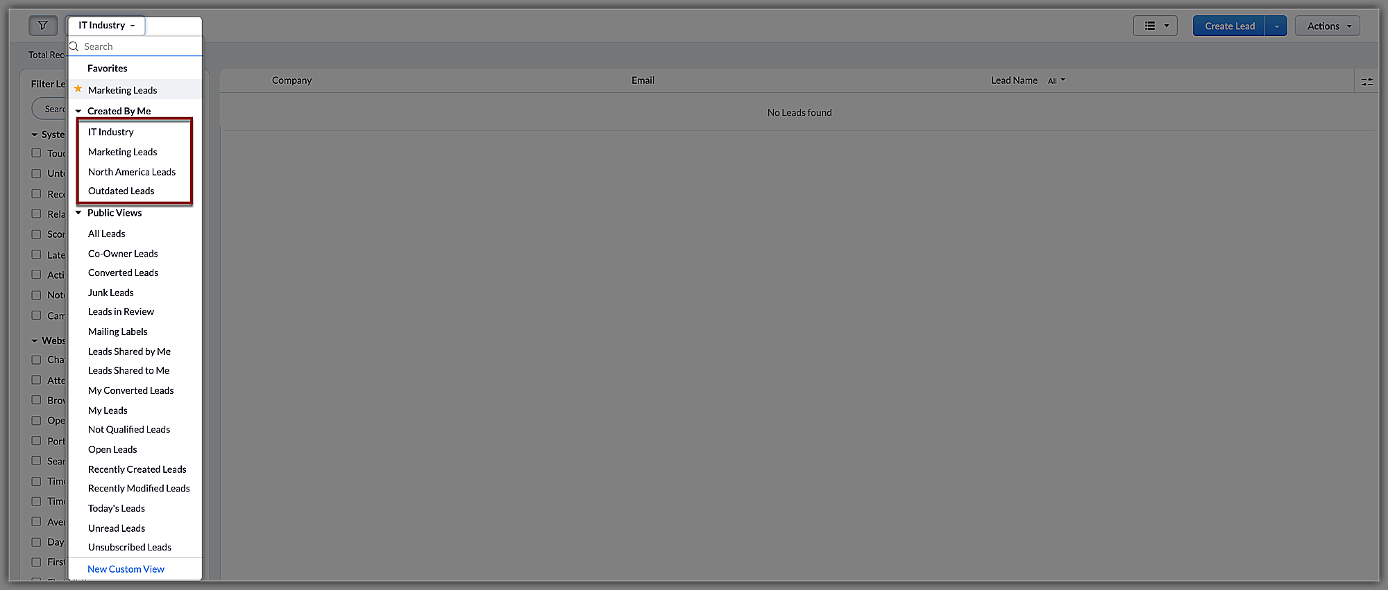 Vizualizare personalizată: Poți crea o vizualizare personalizată în modulul Leads pe baza unor criterii specifice, cum ar fi lead-uri din industria IT, lead-uri interesate să cumpere un laptop sau lead-uri calificate pentru marketing.