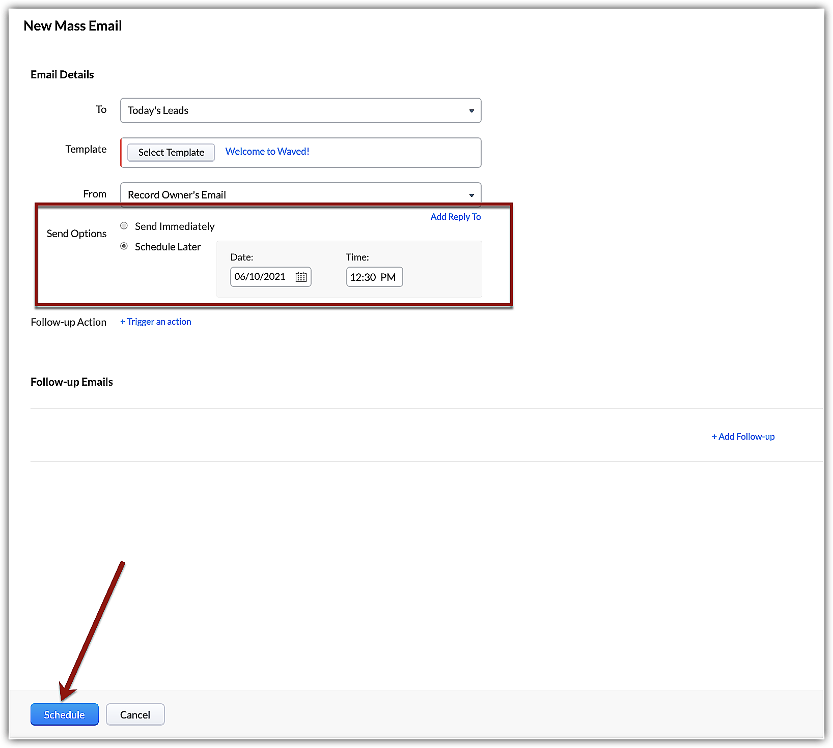 - Pe pagina New Mass Email, introdu detaliile emailului în câmpurile To, Template, From, Send Options, Follow-up Action, și Follow-up Emails.