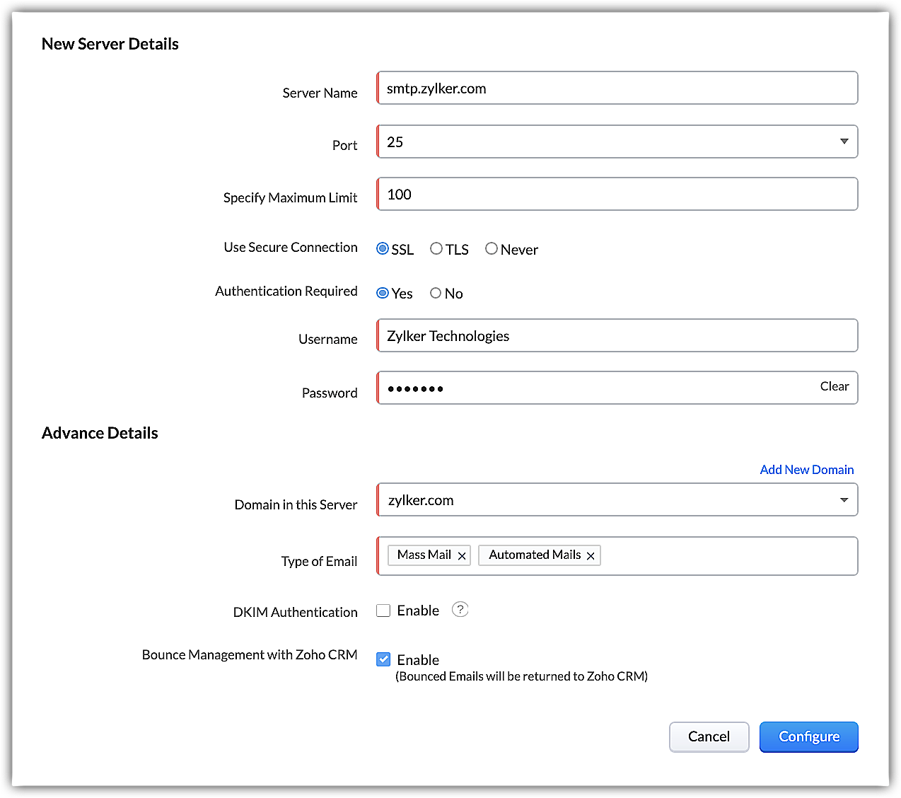 Pentru a configura email relay-uri, va trebui să conectezi serverul tău SMTP cu serverul Zoho CRM.