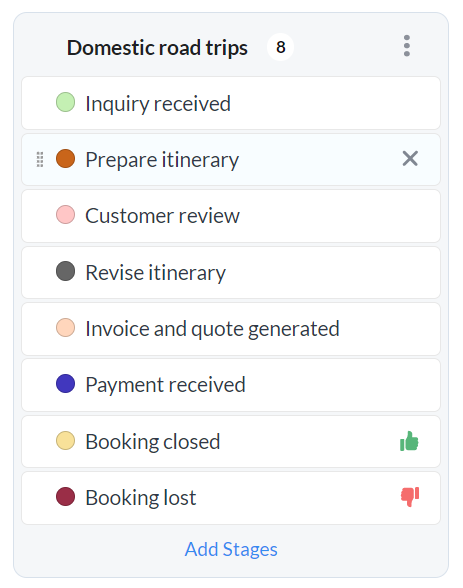Go India Travels este o companie de turism și călătorii care oferă diferite pachete turistice, cum ar fi călătorii interne, internaționale, călătorii de afaceri și tururi educaționale. Pentru diferite pachete turistice, există cerințe distincte. De exemplu, călătoriile internaționale necesită ca călătorii să dețină viză sau pașaport, deși aceste documente nu sunt necesare pentru o călătorie internă. Un singur tip de proces de vânzări nu va fi util în toate situațiile de călătorie, deci Go India Travels a creat multiple pipeline-uri de vânzări pentru vânzarea fiecărui tip de pachet de vacanță.