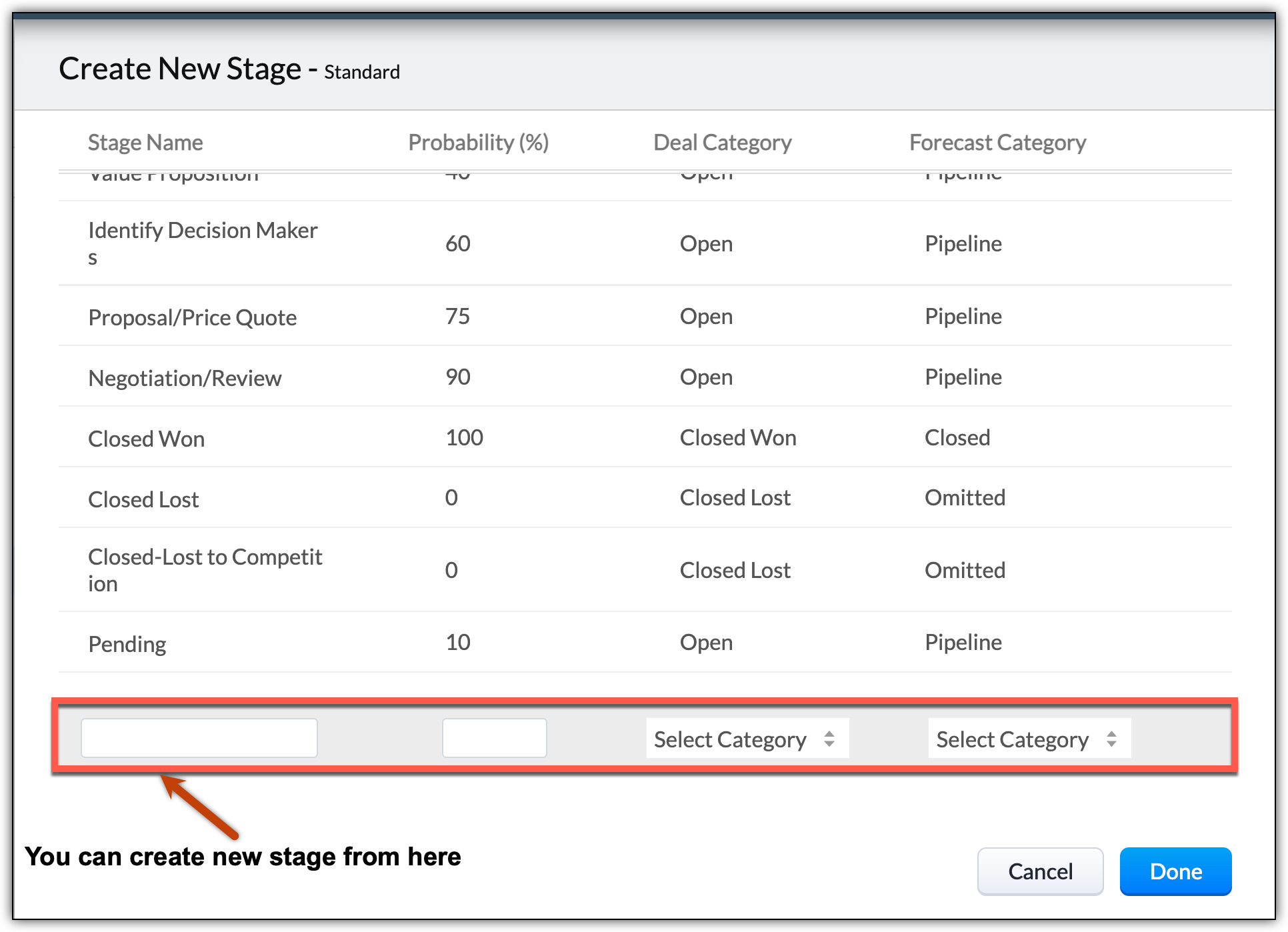 Un pipeline standard este creat automat de Zoho CRM când utilizatorul încearcă să creeze un pipeline nou. Acest pipeline va consta din etapele existente ale tranzacției. Poți redenumi sau personaliza etapele adăugând sau ștergând câmpuri de etapă în pipeline.