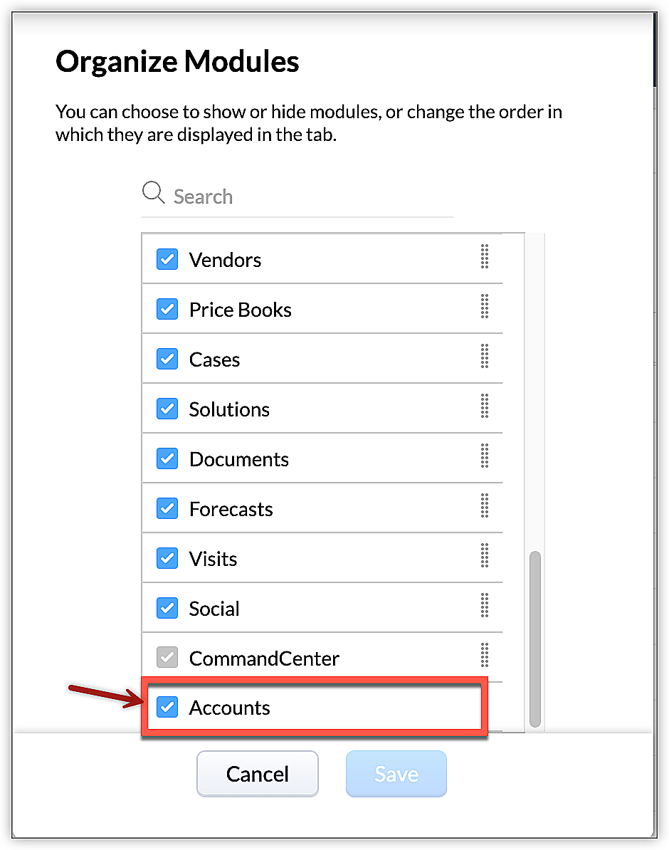 - Dezbifează modulul Accounts din pagina Organize Modules.