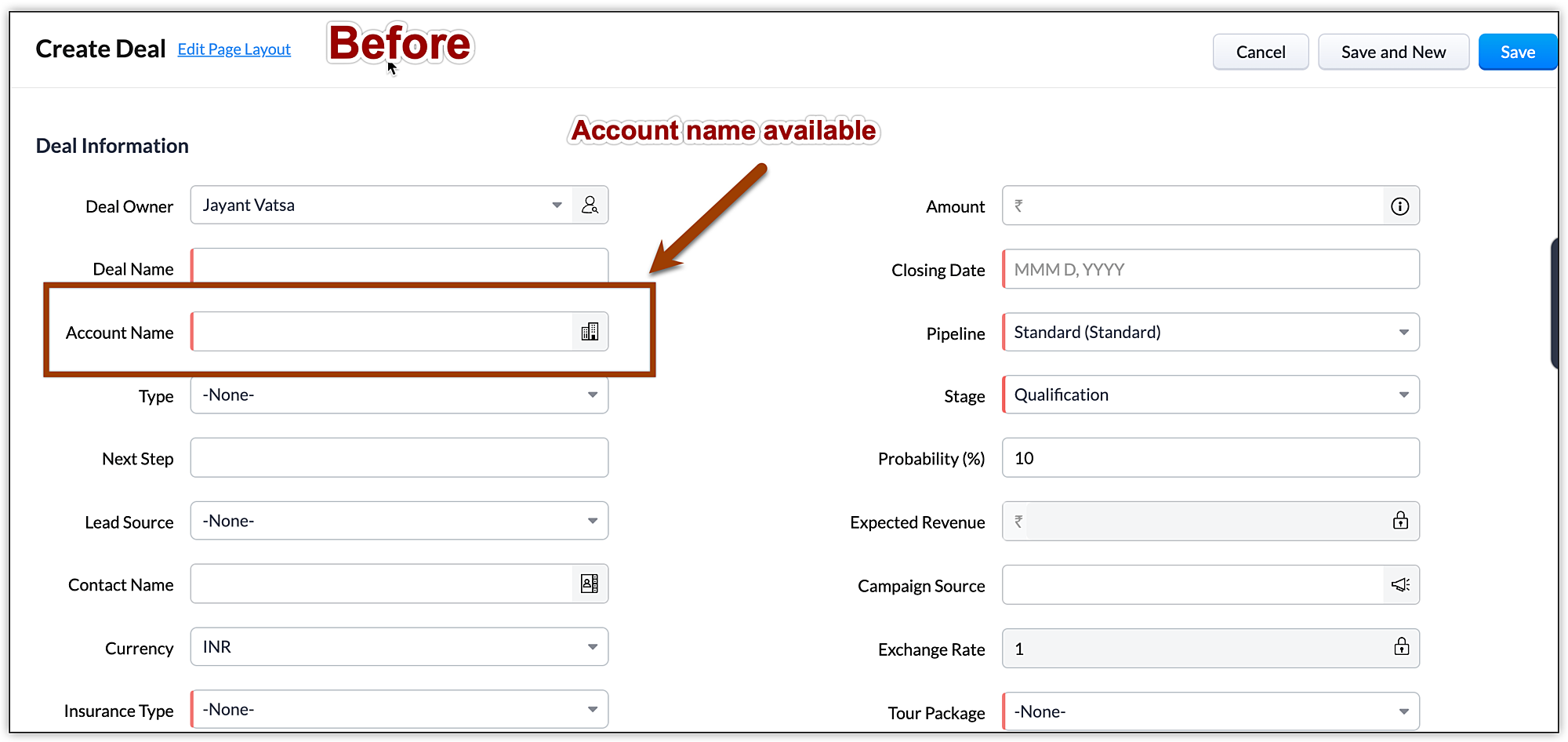 Dacă organizația ta lucrează cu alte companii și cu clienți individuali (atât B2B cât și B2C), dezactivarea modulului Accounts nu va funcționa. În acest caz, trebuie să faci câmpurile Company și Account Name non-obligatorii în ambele module Leads și Deals. Acest lucru îți va permite să salvezi înregistrări fără a completa acele câmpuri.