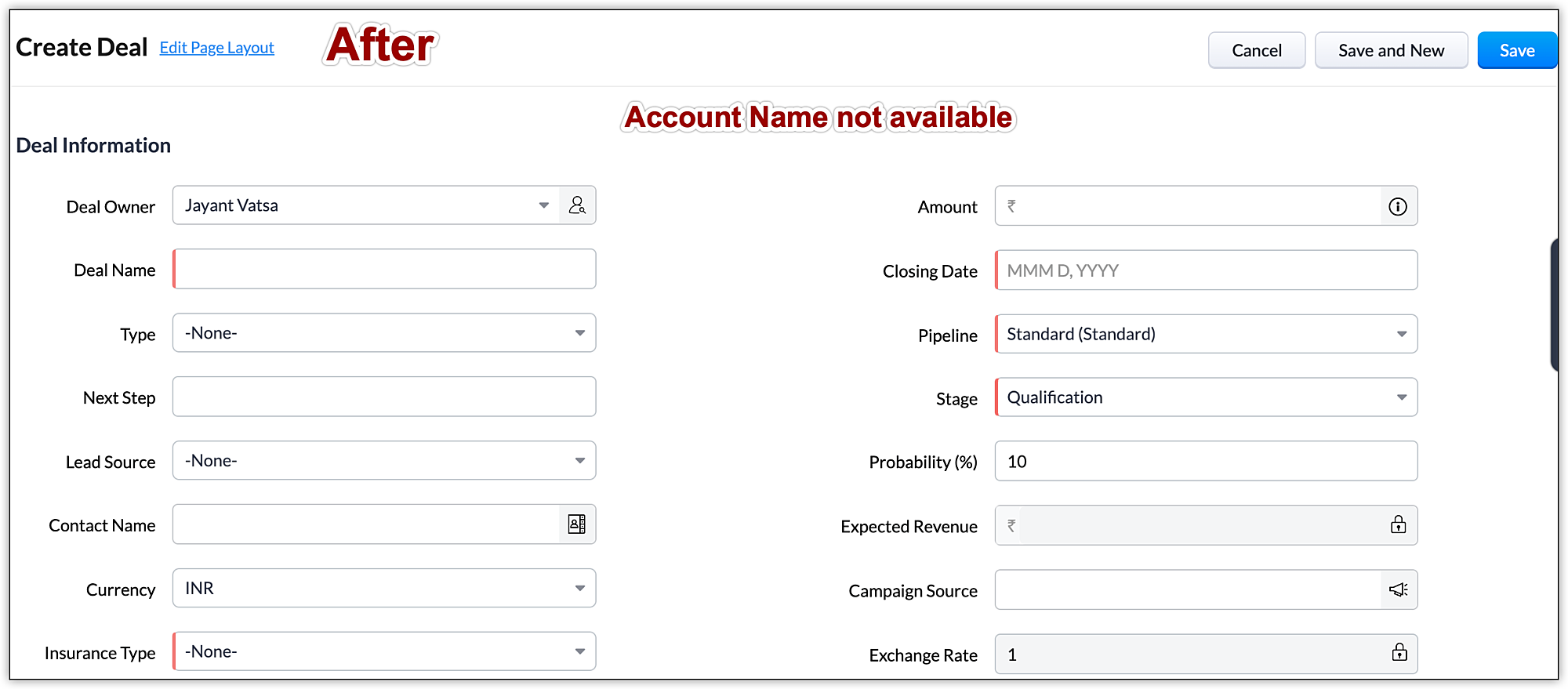 Odată ce modulul Accounts a fost dezactivat, câmpul Account Name nu va mai apărea în pagina Deals când asociezi un deal cu un contact.