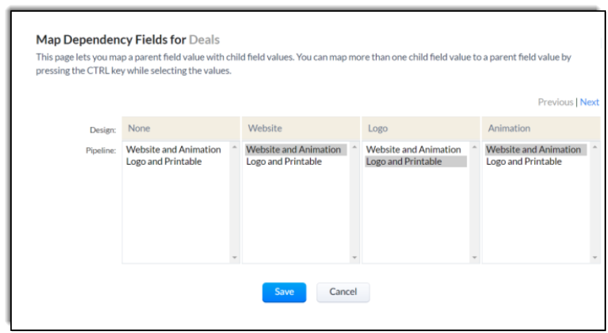Dacă afacerea ta lucrează cu mai multe produse, iar serviciile pe care le oferi se schimbă în funcție de produs, acest lucru adaugă foarte multe date în câmpul dropdown, ceea ce este obositor și confuz. Dar dacă valorile relevante din câmpurile de servicii ar fi populate în funcție de câmpul de produs selectat? Acest lucru ar simplifica procesul. Map dependency este folosit pentru a crea dependențe între două câmpuri relevante. Poți defini ce valori ar trebui să apară în câmpul copil atunci când o anumită valoare este aleasă în câmpul părinte.