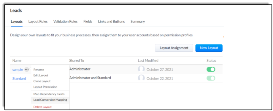 Lead conversion mapping este folosit pentru a mapa câmpurile din diferite module, în timp ce map dependency field creează dependențe între două câmpuri aparținând aceluiași modul. Scopul principal al lead conversion mapping este de a muta datele din modulul de lead-uri în alte module fără a omite niciun câmp. Lead conversion mapping poate fi folosit și atunci când există mai multe layout-uri. Câmpurile din modulul Leads vor diferi în funcție de tipul de layout ales. Cu toate acestea, când lead-urile sunt convertite, ar trebui să te asiguri că sunt mapate la același layout din modulele contacts, accounts și deals. Pentru a asigura acest lucru, folosim Lead conversion mapping.