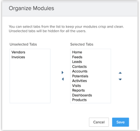 Da, în Zoho CRM poți afișa sau ascunde file în funcție de cerințele tale. Urmează pașii de mai jos pentru a organiza filele: