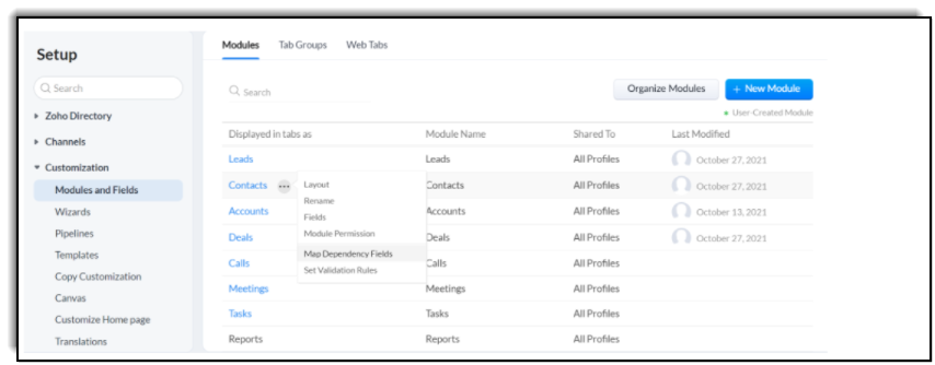 Modulele sau filele sunt ca niște containere care stochează date sau informații legate de afaceri într-un mod organizat. În Zoho CRM, vei găsi module precum Leads, Contacts, Accounts, Activities, care stochează informații esențiale despre prospecții interesați, prospecții care vor să facă afaceri cu tine, organizațiile din care fac parte și tipurile de activități de vânzări în care echipa ta de vânzări îi implică pe clienți.
