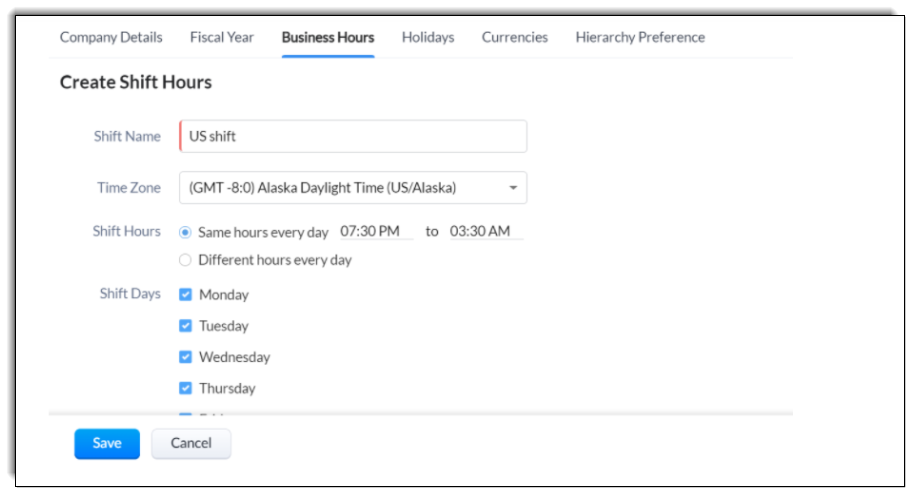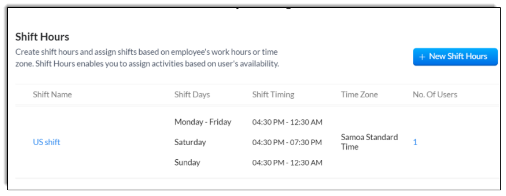 Dacă compania ta operează în fusuri orare diferite sau angajații tăi lucrează la ore diferite, poți crea ture pentru a defini programul lor de lucru. De exemplu, dacă angajații tăi lucrează de la 12:00 la 17:00 sau trebuie să fie disponibili în timpul programului de lucru din SUA, deși sunt localizați în India, poți crea o tură de după-amiază sau o tură pentru SUA.