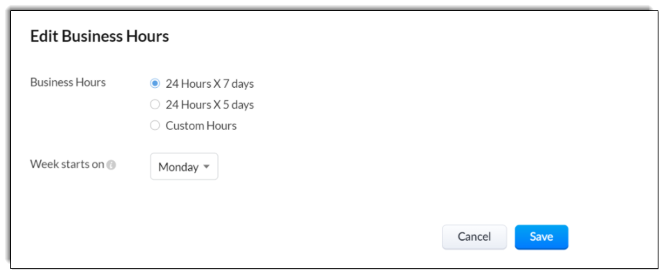 Zoho CRM oferă o listă de programe de lucru implicite pe care le poți seta pentru organizația ta, de exemplu 24 de ore x 7 zile și 24 de ore x 5 zile.