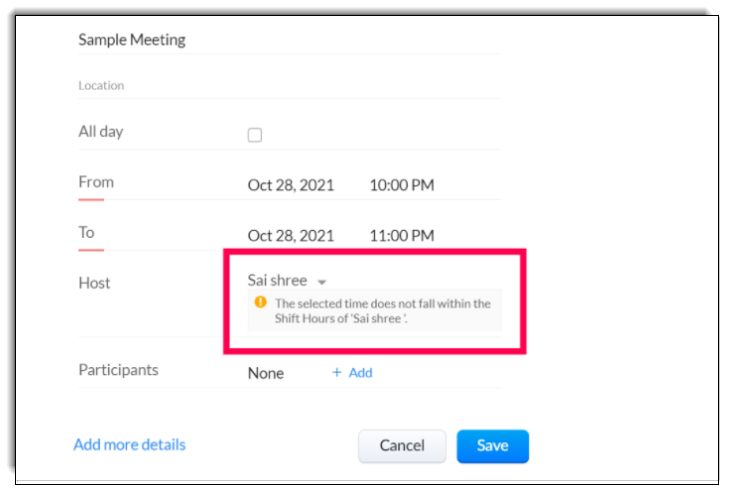 Da, vei fi alertat dacă data sau ora de început și de sfârșit a evenimentului se află în afara programului de lucru al gazdei sau dacă gazda s-a marcat ca indisponibilă pentru acele ore. Vei vedea o alertă când creezi un eveniment.