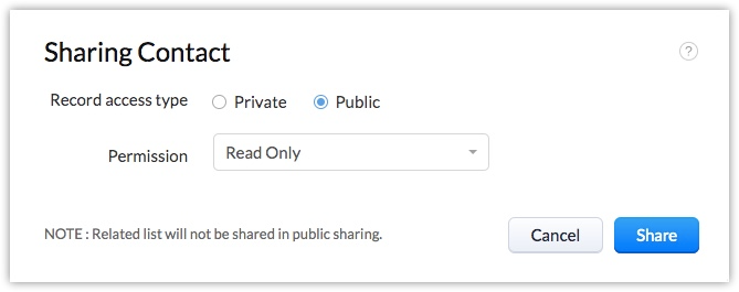 - Partajare indirectă - O înregistrare poate fi partajată ca înregistrare asociată, adică prin lista conexă. De exemplu, o oportunitate poate fi asociată cu un contact, iar când partajezi înregistrarea contactului, oportunitatea va fi și ea partajată cu celălalt utilizator. Acest tip de partajare se numește indirectă sau partajarea înregistrărilor cu lista lor conexă.