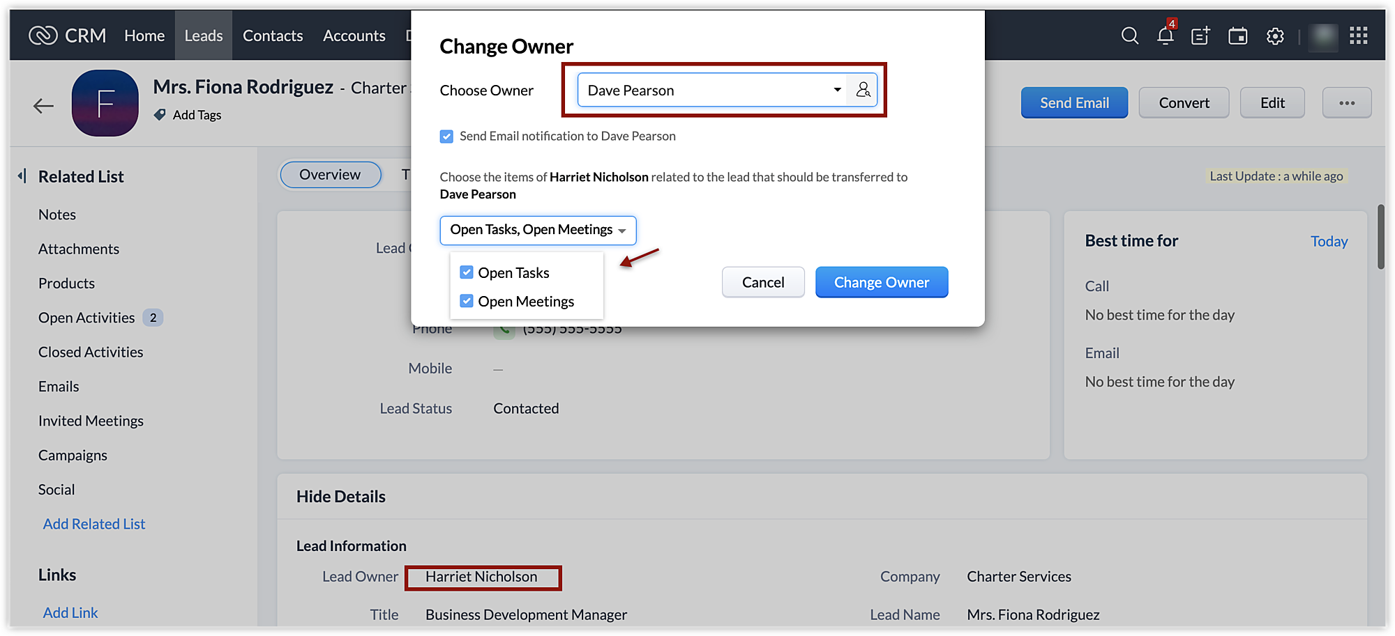 Când schimbi proprietatea unei înregistrări, vei avea opțiunea de a transfera unele sau toate activitățile deschise, cum ar fi întâlnirile și sarcinile, către noul proprietar al înregistrării.