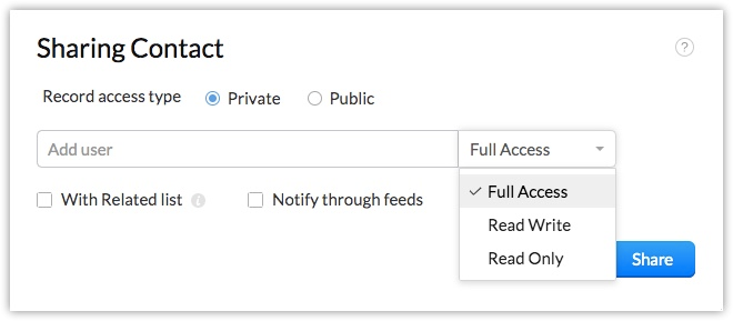 Există trei tipuri de permisiuni care pot fi acordate utilizatorilor la partajarea unei înregistrări, în funcție de acțiunea pe care dorești să o efectueze asupra înregistrării.