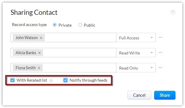 - Bifează caseta Notifică prin feeds pentru a alerta utilizatorii când partajezi înregistrări cu ei.