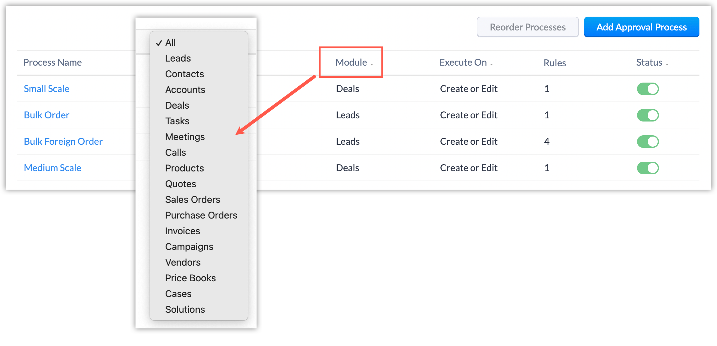 - Fă clic pe antetul Module și selectează modulul ale cărui procese de aprobare dorești să le reordonezi.