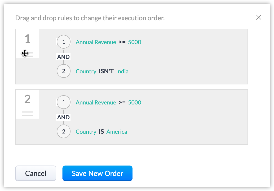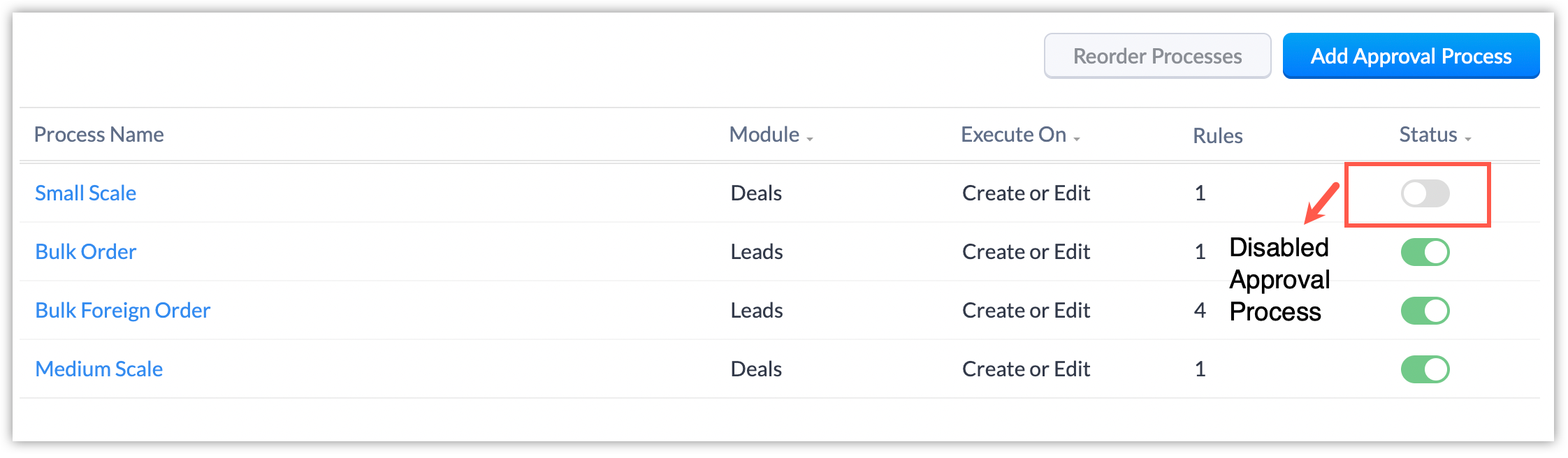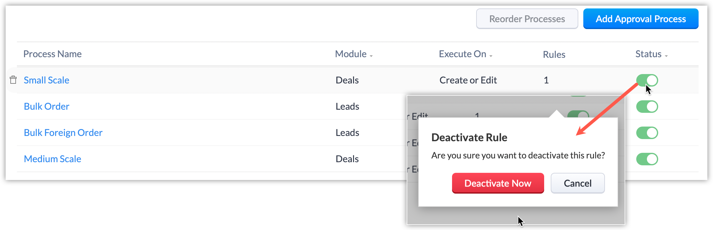 Când există mai multe procese de aprobare pentru un modul, sistemul verifică dacă o înregistrare corespunde criteriilor unui proces de aprobare în aceeași ordine în care este listat. Implicit, procesele de aprobare sunt listate în ordine cronologică, cu primul proces creat în partea de sus a listei. Dacă o înregistrare îndeplinește criteriile mai multor reguli, aceasta va fi trimisă spre aprobare pe baza primei reguli pe care o corespunde în procesul de aprobare dat. Așadar, în funcție de cerințele tale, poți reordona procesele de aprobare. Același lucru este valabil și pentru regulile dintr-un proces de aprobare.