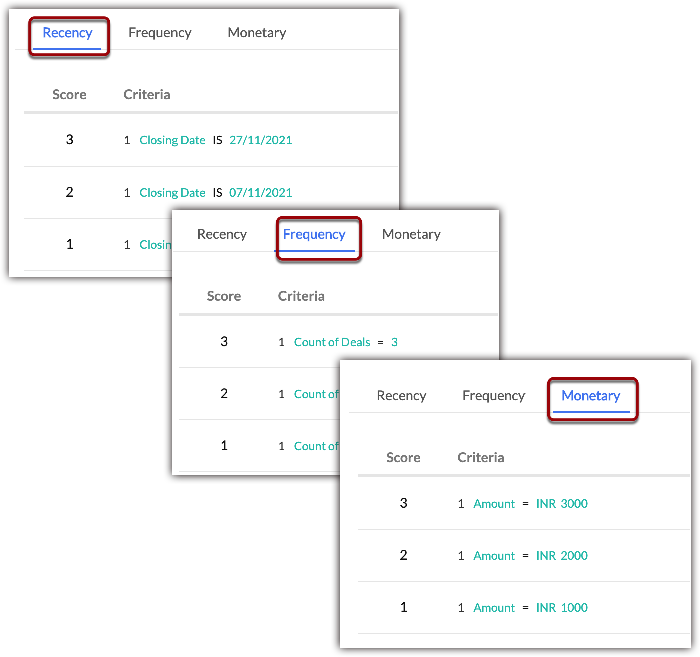 Similar, pentru câmpurile de frecvență și valoare monetară, seturile de date vor fi ordonate de la cea mai mare la cea mai mică apariție și, respectiv, de la cea mai mare la cea mai mică valoare.