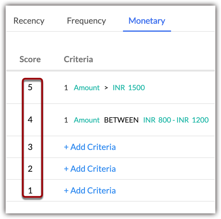 - În câmpul Valoare monetară, setează scorul ca 5 dacă suma cheltuită este mai mare de $1500 și 4 dacă suma este între $800 și $1200.