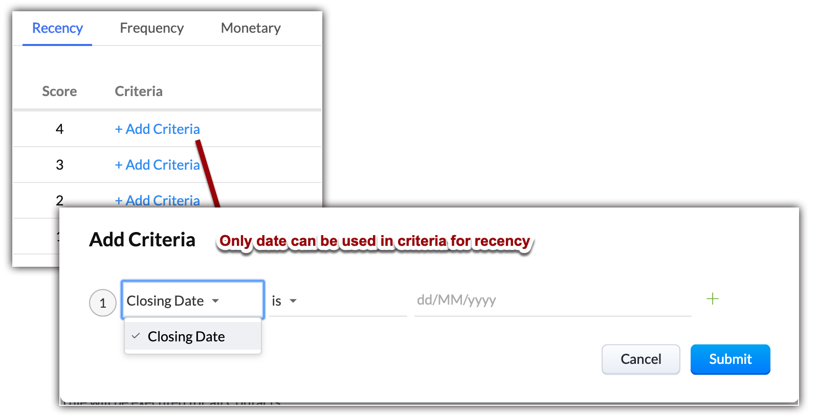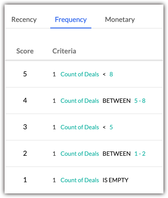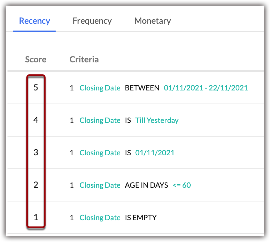 - Introdu scorul de Recență ca 5 dacă data închiderii este „între această săptămână și săptămâna trecută" sau „nu este luna trecută". Similar, scorul va fi 4 dacă data ultimei achiziții este „până ieri".